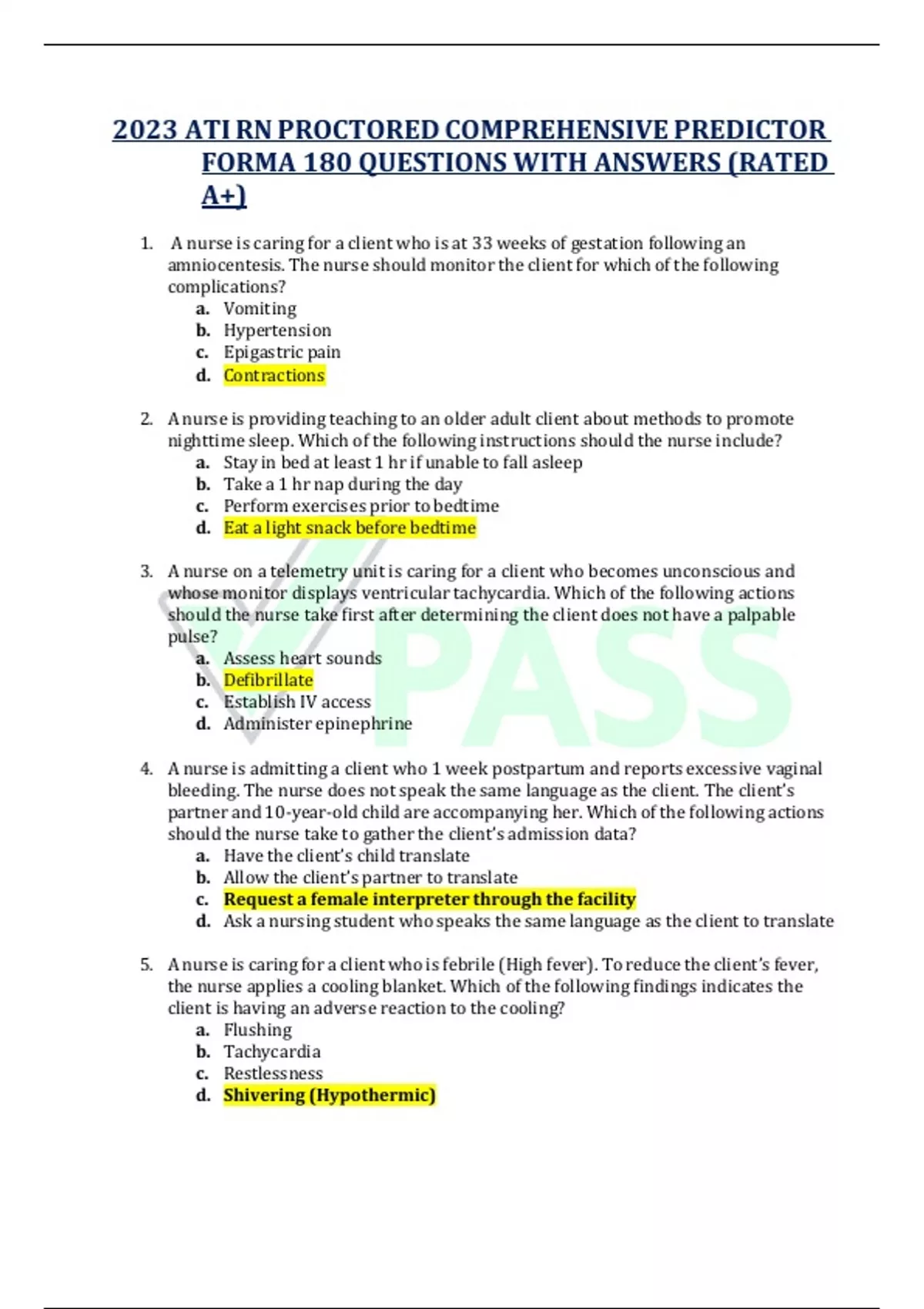 2023 ATIRNPROCTORED COMPREHENSIVE PREDICTOR FORMA 180 QUESTIONS WITH ANSWERS (RATED A+) A nurse is caring for a client who is at 33 weeks of gestation following an amniocentesis. The nurse should monitor the client for which of the following complications? a. Vomiting b. Hypertension c. Epigastric pain d. Contractions
