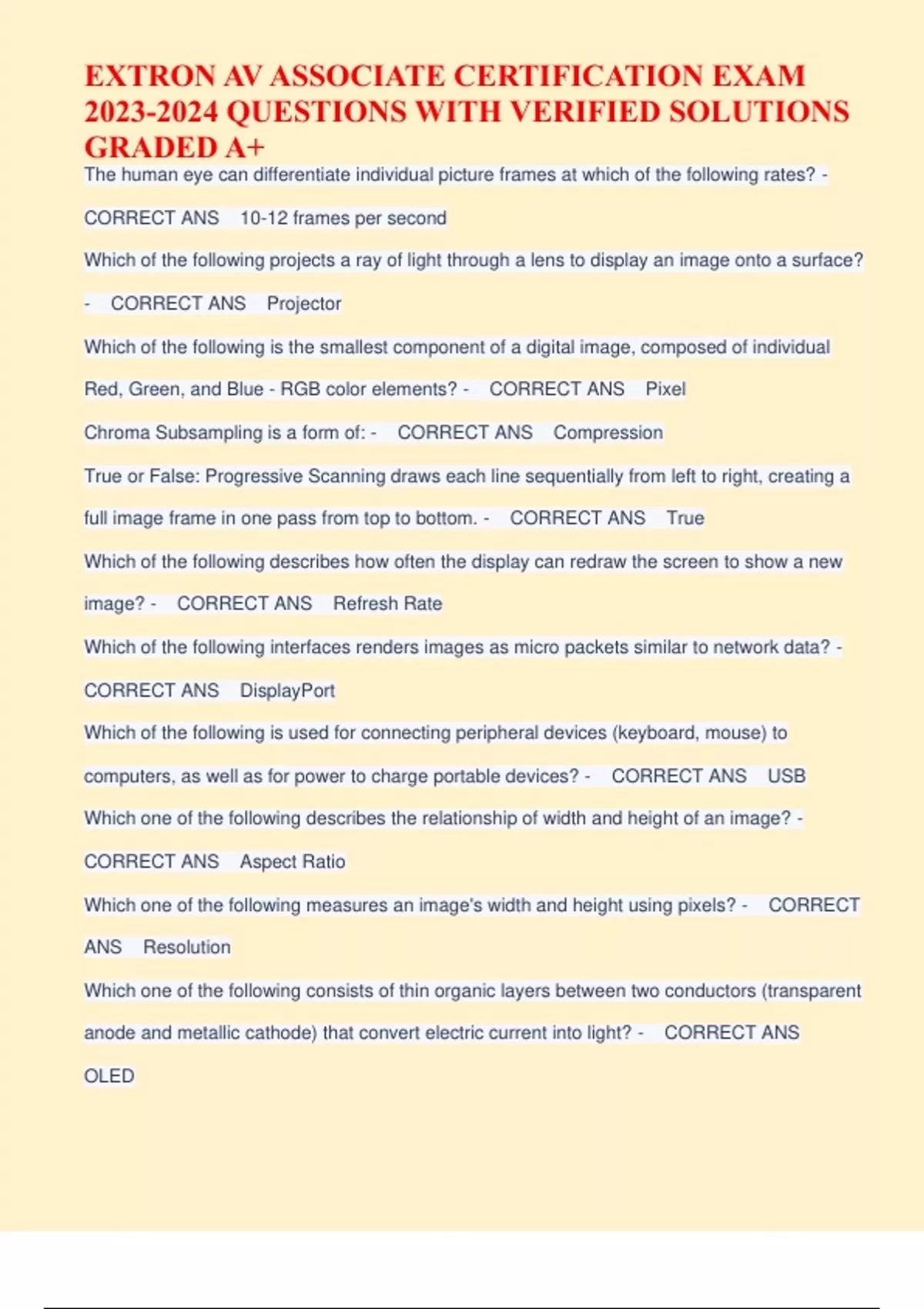 The human eye can differentiate individual picture frames at which of the following rates? - CORRECT ANS 10-12 frames per second Which of the following projects a ray of light through a lens to display an image onto a surface? - CORRECT ANS Projector Which of the following is the smallest component of a digital image, composed of individual Red, Green, and Blue - RGB color elements? - CORRECT ANS Pixel Chroma Subsampling is a form of: - CORRECT ANS Compression True or False: Progressive Scanning draws each line sequentially from left to right, creating a full image frame in one pass from top to bottom. - CORRECT ANS True Which of the following describes how often the display can redraw the screen to show a new image? - CORRECT ANS Refresh Rate Which of the following interfaces renders images as micro packets similar to network data? - CORRECT ANS DisplayPort Which of the following is used for connecting peripheral devices (keyboard, mouse) to computers, as well as for power to charge portable devices? - CORRECT ANS USB Which one of the following describes the relationship of width and height of an image? - CORRECT ANS Aspect Ratio Which one of the following measures an image's width and height using pixels? - CORRECT ANS Resolution Which one of the following consists of thin organic layers between two conductors (transparent anode and metallic cathode) that convert electric current into light? - CORRECT ANS OLED Which one of the following is a reflective surface made up of thousands of tiny mirrors, each representing a single pixel? - CORRECT ANS DLP Which one of the following is the smallest component of a screen image, composed of individual Red, Green, and Blue - RGB primary colors? - CORRECT ANS Pixels Interlaced scanning may be described as: - CORRECT ANS Images drawn in two alternate fields as odd & even numbered lines Which one of the following indicates the amount of data used per pixel to present color information? - CORRECT ANS Color Bit Depth Which one of the following is a digital transmission interface for uncompressed video, multi-channel audio, and control data that also supports High-bandwidth Digital Content Protection - HDCP? - CORRECT ANS HDMI (High Definition Multimedia Interface) Which one of the following digital broadcast standards is adopted in Europe, Asia, and Africa? - CORRECT ANS DVB (Digital Video Broadcasting) DVI and HDMI both use a signaling method known as: - CORRECT ANS TMDS (Transmission-Minimized Differential Signaling) Which of the following defines the science or study of sound, how it's created, its ability to travel within a space, and the way it's managed? - CORRECT ANS Acoustics Which of the following represents a logarithmic ratio to measure the change in sound intensity or electric signals? - CORRECT ANS Decibel