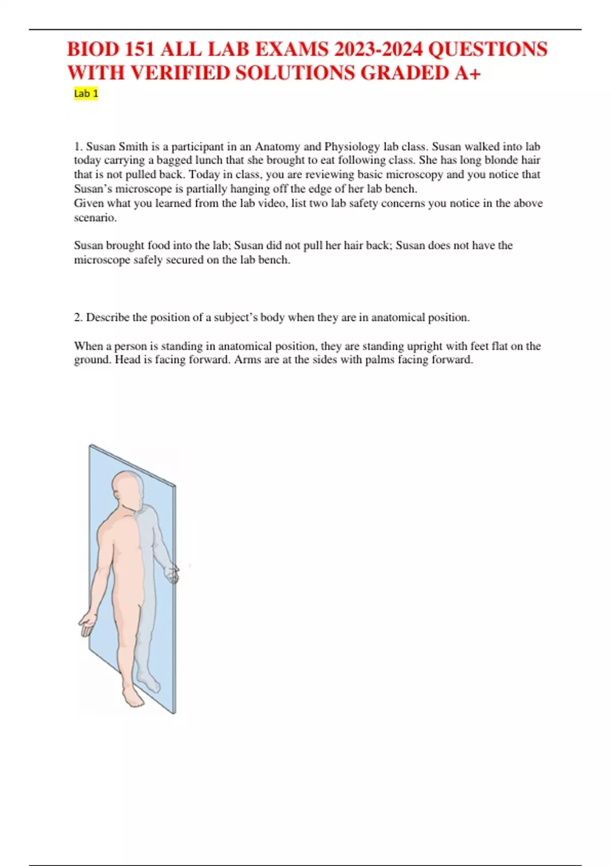 Lab 1 1. Susan Smith is a participant in an Anatomy and Physiology lab class. Susan walked into lab today carrying a bagged lunch that she brought to eat following class. She has long blonde hair that is not pulled back. Today in class, you are reviewing basic microscopy and you notice that Susan’s microscope is partially hanging off the edge of her lab bench. Given what you learned from the lab video, list two lab safety concerns you notice in the above scenario. Susan brought food into the lab; Susan did not pull her hair back; Susan does not have the microscope safely secured on the lab bench. 2. Describe the position of a subject’s body when they are in anatomical position. When a person is standing in anatomical position, they are standing upright with feet flat on the ground. Head is facing forward. Arms are at the sides with palms facing forward. 3. Which of the following planes best describes the above image? a. Frontal Plane b. Sagittal Plane c. Mid-Sagittal Plane d. Transverse Plane c. Mid-Sagittal Plane 4. Which of the following planes best describes the above image? a. Frontal Plane b. Mid-Sagittal Plane c. Sagittal Plane d. Transverse Plane a. Frontal Plane 1. When comparing the relationship of the eyes to the occipital (back portion) region of the head, which of the following terms best describes the occipital region? a. Ventral b. Dorsal c. Anterior d. Posterior e. a. and c. f. b. and d. f. b. and d. 2. When looking at the body in anatomical position, which of the following statements best describes the relationship of the legs to the ribs? a. The legs are distal to the ribs b. The legs are inferior to the ribs c. The legs are lateral to the ribs d. The legs are superficial to the ribs b. The legs are inferior to the ribs 3. When looking at the body in anatomical position, which of the following statements best describes the relationship of the trunk to the arms? a. The trunk is medial to the arms b. The trunk is proximal to the arms c. The trunk is lateral to the arms d. The trunk is superficial to the arms a. the trunk is medial to the arms 4. When looking at the body in anatomical position, which of the following statements best describes the relationship of the knee to the ankle? a. The knee is distal to the ankle b. The knee is superior to the ankle c. The knee is proximal to the ankle d. b. and c. e. none of the above are correct statements d. b. and c. 5. A surgeon is about to perform surgery and directs his OR team to place the patient in the supine position. Describe what the supine position is. The supine position is lying on the back, face upward. 1. The crus is part of which skeletal division? a. The axial division b. The appendicular division c. Neither division b. The appendicular division 2. Which of the following statements is false? a. The two main body cavities are the dorsal and ventral cavities. b. The thoracic cavity contains 2 subdivisions. c. The ventral cavity can be subdivided into the thoracic and abdominopelvic cavities. d. All of the statements are true statements. b. The thoracic cavity contains 2 subdivisions. (It contains 3 subdivisions.) 3. Which of the following lines the lungs? a. The parietal pleura b. The meninges c. The visceral pleura c. The visceral pleura 4. Which of the following is a true statement? a. Inflammation of the pleural lining is referred to as pleurisy. b. Inflammation of the pericardium is referred to as carditis. c. a. and b. d. None of the statements are true. a. Inflammation of the pleural lining is referred to as pleurisy. 5. Describe what the term “retroperitoneal” means and give an example of a retroperitoneal organ. Retroperitoneal organs are located between the peritoneum and the dorsal body cavity. Examples include the kidneys, portions of the pancreas, the adrenal glands, and portions of the digestive organs. Retroperitoneal means situated behind the peritoneal cavity, between the peritoneum and dorsal cavity. An example of a retroperitoneal organ is kidney. 1. Describe the proper way to carry a microscope. You should always carry a microscope by placing one hand under the base while the other hand braces the arm.