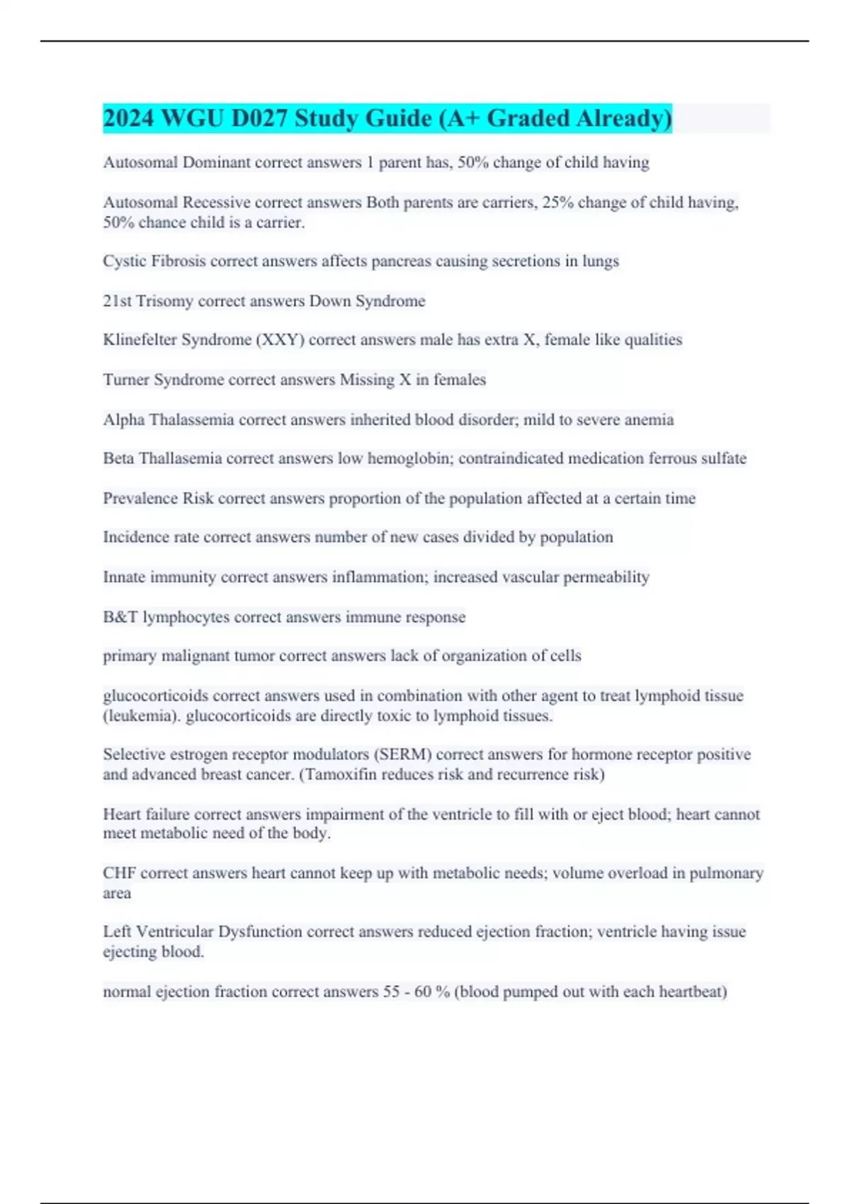 Autosomal Dominant correct answers 1 parent has, 50% change of child having Autosomal Recessive correct answers Both parents are carriers, 25% change of child having, 50% chance child is a carrier. Cystic Fibrosis correct answers affects pancreas causing secretions in lungs 21st Trisomy correct answers Down Syndrome Klinefelter Syndrome (XXY) correct answers male has extra X, female like qualities Turner Syndrome correct answers Missing X in females Alpha Thalassemia correct answers inherited blood disorder; mild to severe anemia Beta Thallasemia correct answers low hemoglobin; contraindicated medication ferrous sulfate Prevalence Risk correct answers proportion of the population affected at a certain time Incidence rate correct answers number of new cases divided by population Innate immunity correct answers inflammation; increased vascular permeability B&T lymphocytes correct answers immune response primary malignant tumor correct answers lack of organization of cells glucocorticoids correct answers used in combination with other agent to treat lymphoid tissue (leukemia). glucocorticoids are directly toxic to lymphoid tissues. Selective estrogen receptor modulators (SERM) correct answers for hormone receptor positive and advanced breast cancer. (Tamoxifin reduces risk and recurrence risk) Heart failure correct answers impairment of the ventricle to fill with or eject blood; heart cannot meet metabolic need of the body. CHF correct answers heart cannot keep up with metabolic needs; volume overload in pulmonary area Left Ventricular Dysfunction correct answers reduced ejection fraction; ventricle having issue ejecting blood. normal ejection fraction correct answers 55 - 60 % (blood pumped out with each heartbeat)