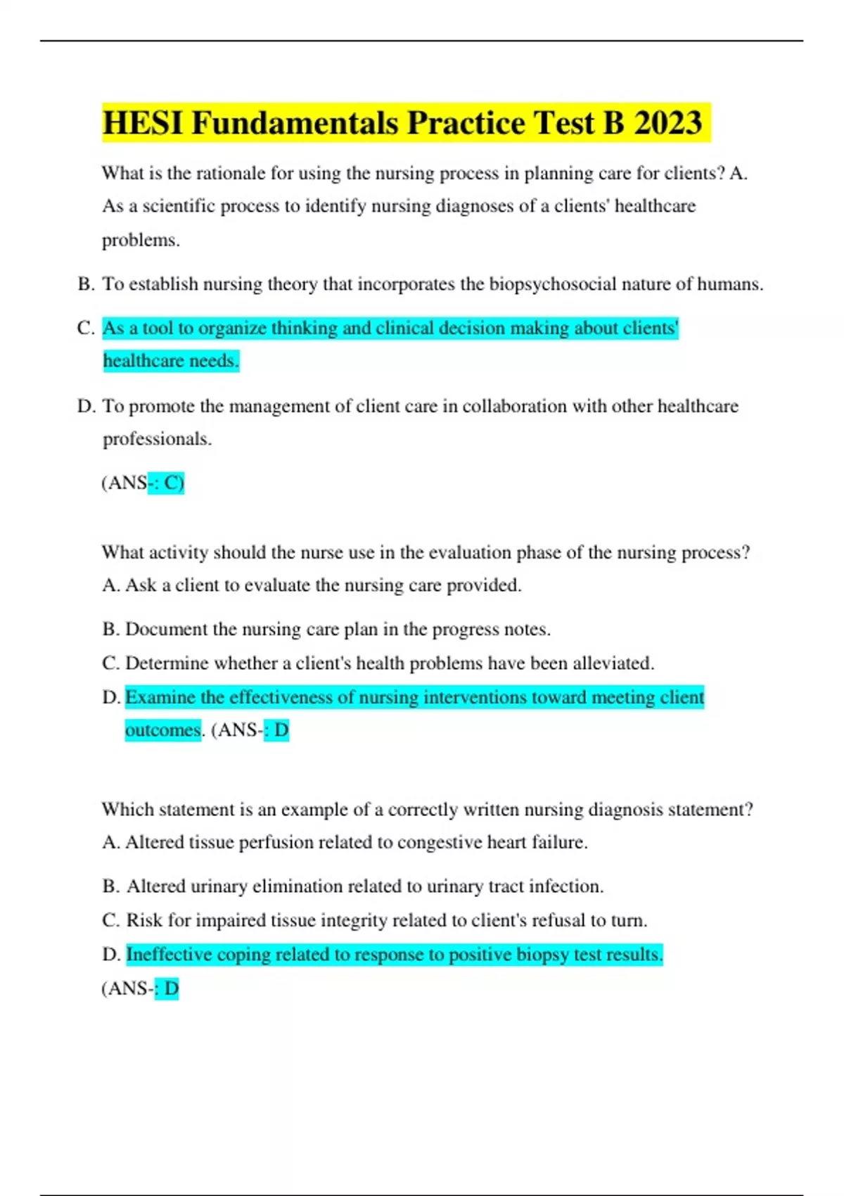 What is the rationale for using the nursing process in planning care for clients? A. As a scientific process to identify nursing diagnoses of a clients' healthcare problems. B. To establish nursing theory that incorporates the biopsychosocial nature of humans. C. As a tool to organize thinking and clinical decision making about clients' healthcare needs. D. To promote the management of client care in collaboration with other healthcare professionals. (ANS-: C) What activity should the nurse use in the evaluation phase of the nursing process? A. Ask a client to evaluate the nursing care provided. B. Document the nursing care plan in the progress notes. C. Determine whether a client's health problems have been alleviated. D. Examine the effectiveness of nursing interventions toward meeting client outcomes. (ANS-: D Which statement is an example of a correctly written nursing diagnosis statement? A. Altered tissue perfusion related to congestive heart failure. B. Altered urinary elimination related to urinary tract infection. C. Risk for impaired tissue integrity related to client's refusal to turn. D. Ineffective coping related to response to positive biopsy test results. (ANS-: D What action by the nurse demonstrates culturally sensitive care? A. Asks permission before touching a client. B. Avoids questions about male-female relationships. C. Explains the differences between Western medical care and cultural folk remedies. D. Applies knowledge of a cultural group unless a client embraces Western customs. (ANS-: A A nurse is becoming increasingly frustrated by the family members' efforts to participate in the care of a hospitalized client. What action should the nurse implement to cope with these feelings of frustration? A. Suggest that other cultural practices be substituted by the family members. B. Examine one's own culturally based values, beliefs, attitudes, and practices. C. Explain to the family that multiple visitors are exhausting to the client. D. Allow the situation to continue until a family member's action may harm the client. (ANS-: B Which technique is most important for the nurse to implement when performing a physical assessment? A. A head-to-toe approach. B. The medical systems model. C. A consistent, systematic approach. D. An approach related to a nursing model. (ANS-: C A 73-year-old Hispanic client is seen at the community health clinic with a history of protein malnutrition. What information should the nurse obtain first? A. Amount of liquid protein supplements consumed daily. B. Foods and liquids consumed during the past 24 hours. C. Usual weekly intake of milk products and red meats. D. Grains and legume combinations used by the client. (ANS-: B The nurse formulates the nursing diagnosis of, "Ineffective health maintenance related to lack of motivation" for a client with Type 2 diabetes. Which finding supports this nursing diagnosis? A. Does not check capillary blood glucose as directed. B. Occasionally forgets to take daily prescribed medication. C. Cannot identify signs or symptoms of high and low blood glucose. D. Eats anything and does not think diet makes a difference in health. (ANS: D Which statement correctly identifies a written learning objective for a client with peripheral vascular disease? A. The nurse will provide client instruction for daily foot care. B. The client will demonstrate proper trimming toenail technique. C. Upon discharge, the client will list three ways to protect the feet from injury. D. After instruction, the nurse will ensure the client understands foot care rationale. (ANS-: C A middle-aged woman who enjoys being a teacher and mentor feels that she should pass down her legacy of knowledge and skills to the younger generation. According to Erikson, she is involved in what developmental stage? A. Generativity. B. Ego integrity. C. Identification. D. Valuing wisdom (ANS-: A Which statement best describes durable power of attorney for health care? A. The client signs a document that designates another person to make legally binding healthcare decisions if client is unable to do so. B. The healthcare decisions made by another person designated by the client are not legally binding. C. Instructions about actions to be taken in the event of a client's terminal or irreversible conditi