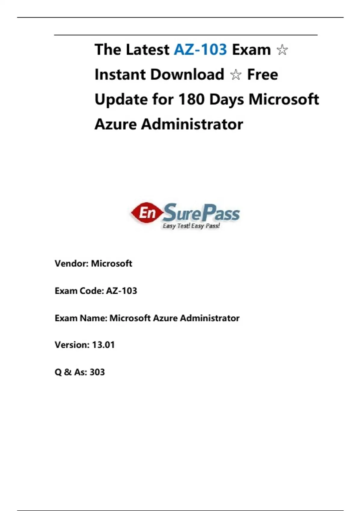 The Latest AZ-103 Exam ☆ Instant Download ☆ Free Update for 180 Days Microsoft Azure Administrator Vendor: Microsoft Exam Code: AZ-103 Exam Name: Microsoft Azure Administrator Version: 13.01 Q & As: 303