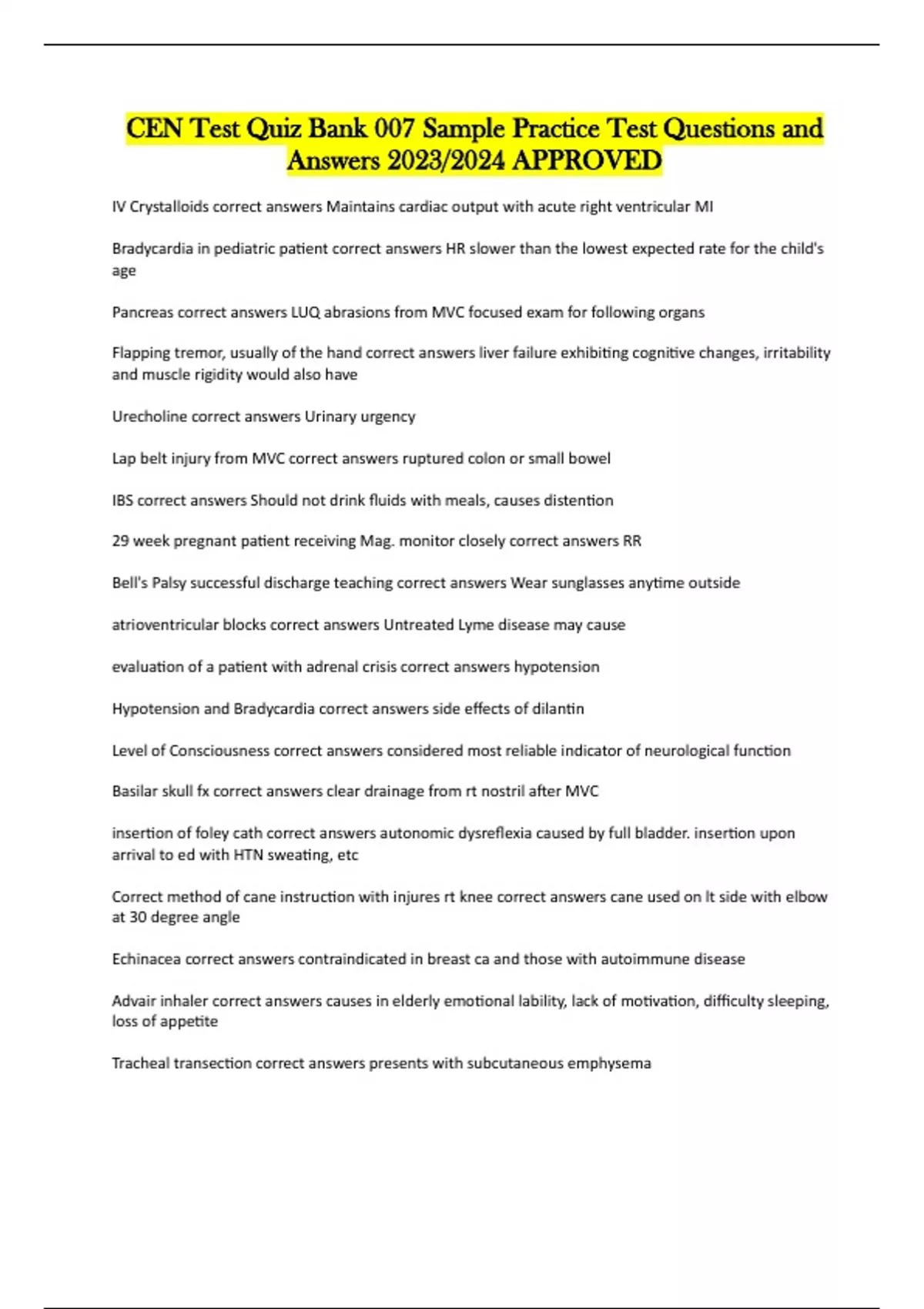CEN Test Quiz Bank 007 Sample Practice Test Questions and Answers 2023/2024 APPROVED