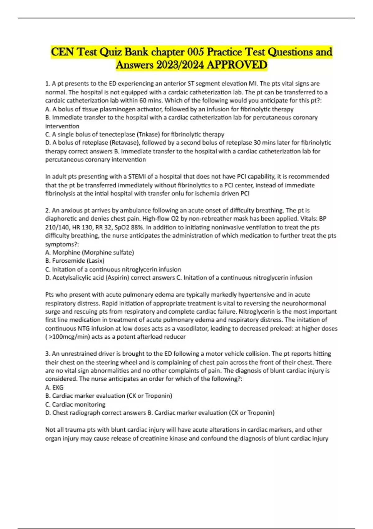 CEN Test Quiz Bank chapter 005 Practice Test Questions and Answers 2023/2024 APPROVED 1. A pt presents to the ED experiencing an anterior ST segment elevation MI. The pts vital signs are normal. The hospital is not equipped with a cardaic catheterization lab. The pt can be transferred to a cardaic catheterization lab within 60 mins. Which of the following would you anticipate for this pt?: A. A bolus of tissue plasminogen activator, followed by an infusion for fibrinolytic therapy B. Immediate transfer to the hospital with a cardiac catheterization lab for percutaneous coronary intervention C. A single bolus of tenecteplase (Tnkase) for fibrinolytic therapy D. A bolus of reteplase (Retavase), followed by a second bolus of reteplase 30 mins later for fibrinolytic therapy correct answers B. Immediate transfer to the hospital with a cardiac catheterization lab for percutaneous coronary intervention In adult pts presenting with a STEMI of a hospital that does not have PCI capability, it is recommended that the pt be transferred immediately without fibrinolytics to a PCI center, instead of immediate fibrinolysis at the intial hospital with transfer onlu for ischemia driven PCI 2. An anxious pt arrives by ambulance following an acute onset of difficulty breathing. The pt is diaphoretic and denies chest pain. High-flow O2 by non-rebreather mask has been applied. Vitals: BP 210/140, HR 130, RR 32, SpO2 88%. In addition to initiating noninvasive ventilation to treat the pts difficulty breathing, the nurse anticipates the administration of which medication to further treat the pts symptoms?: A. Morphine (Morphine sulfate) B. Furosemide (Lasix) C. Initation of a continuous nitroglycerin infusion D. Acetylsalicylic acid (Aspirin) correct answers C. Initation of a continuous nitroglycerin infusion Pts who present with acute pulmonary edema are typically markedly hypertensive and in acute respiratory distress. Rapid initiation of appropriate treatment is vital to reversing the neurohormonal surge and rescuing pts from respiratory and complete cardiac failure. Nitroglycerin is the most important first line medication in treatment of acute pulmonary edema and respiratory distress. The initation of continuous NTG infusion at low doses acts as a vasodilator, leading to decreased preload: at higher doses ( >100mcg/min) acts as a potent afterload reducer 3. An unrestrained driver is brought to the ED following a motor vehicle collision. The pt reports hitting their chest on the steering wheel and is complaining of chest pain across the front of their chest. There are no vital sign abnormalities and no other complaints of pain. The diagnosis of blunt cardiac injury is considered. The nurse anticipates an order for which of the following?: A. EKG B. Cardiac marker evaluation (CK or Troponin) C. Cardiac monitoring D. Chest radiograph correct answers B. Cardiac marker evaluation (CK or Troponin) Not all trauma pts with blunt cardiac injury will have acute alterations in cardiac markers, and other organ injury may cause release of creatinine kinase and confound the diagnosis of blunt cardiac injury 4. Which of the following is a form of distributive shock?: A. Neurogenic B. Metabolic C. Respiratory D. Obstructive correct answers A. Neurogenic 5. A pt presents following an acute onset of chest pain, dyspnea and severe diaphoresis, with near syncope. Assessment shows a pt in severe distress, with HR 110, BP 60/40 and RR 36 with bilateral rales. An EKG reveals ST segment elevation across the precordial leads. A diagnosis of acute MI with cardiogenic shock is made, and the pt is being prepared for transfer to the cardiac cath lab. The vasopressor of choice, based on this pts degree of hypotension is: A. Norepineprhine (Levophed) B. Dopamine (Inotropin) C. Dobutamine (Dobutrex) D. Vasopressin (Pitressin) correct answers A. Norepineprhine (Levophed) The intial use of norepinephrine for marked hypotension, <70mmHg systolic is the current recommendation from the AHA 6. A pt presents with complaints of chest pain that radiates to the jaw, stating the pain is a 6/10. Other symptoms include nausea, dizziness, shortness of breath with clear lung sounds, and a sense of impending doom. The pain started 40 mins before arrival. Vitals: BP 116/58, HR 98, RR 20, SpO2 94%, T 98.6F. The 12 lead EKG shows inferior wall myocardial injury pattern. Which clinical presentations indicate the need to complete a right sided 12 lead EKG?: A. Shortness of breath with clear lung sounds B. Nausea and dizziness C. Chest pain with radiation to the jaw D. Sense of impending doom correct answers A. Shortness of breath with clear lung sounds Classic right ventricular infarcts are associated with the absence of pulmonary congestion Think: RIGHT to my foot 7. Following the successful resuscitation of a pt in a cardiac arrest, which of the following findings is the best indicator high-quality CPR?: A. A compression depth of 1 1/2 inches B. Palpable pulses with the preformance of chest compressions during CPR C. A decrease of skin and mucus membrane cyanosis D. An increasing end tital Co2 level correct answers D. An increasing end tital Co2 level An increasing end-tidal carbon dioxide level indicates increasing cellular perfusion with effective CPR or ROSC 8. During transcutaneous pacing for a pt in third-degree heart block, there is a loss of ventricular capture. Which is a significant physiological reason for loss of a pacemaker capture?: A. Metabolic alkalosis B. Hypomagnesemia C. Lactic acidosis D. Hypokalemia correct answers C. Lactic acidosis
