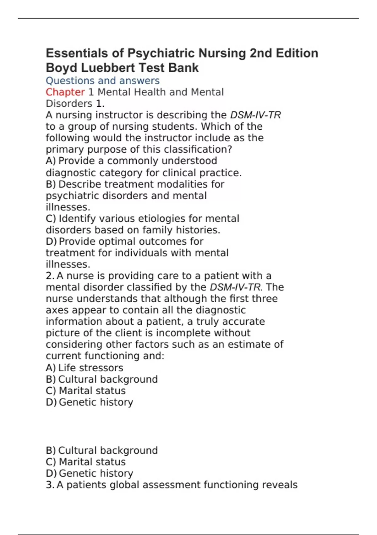 Essentials of Psychiatric Nursing 2nd Edition Boyd Luebbert Test Bank Questions and answers A nursing instructor is describing the DSM-IV-TR to a group of nursing students. Which of the following would the instructor include as the primary purpose of this classification?
