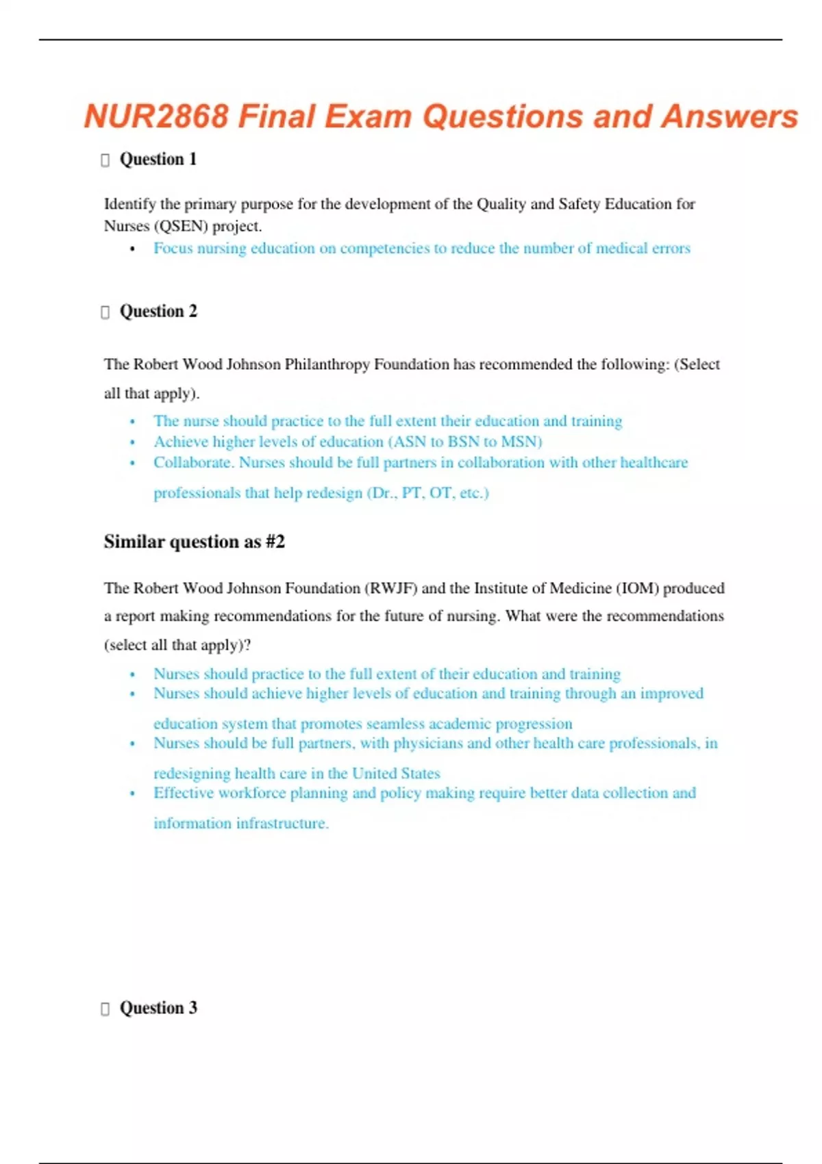 NUR2868 FINAL EXAM 50 QUESTIONS WITH VERIFIED CORRECT ANSWERS/A+ GRADE GUARANTEED 2024 NUR2868 FINAL EXAM 50 QUESTIONS WITH VERIFIED CORRECT ANSWERS/A+ GRADE GUARANTEED 2024 Question 1 0 out of 1 points Identify the primary purpose for the development of the Quality and Safety Education for Nurses (QSEN) project. c. focus nursing education on competencies to reduce the number of medical errors Question 2 1 out of 1 points The Robert Wood Johnson Foundation has recommended the following: (Select all that apply). Question 3 0 out of 1 points Identify the health-care area in which the use of computers has improved the efficiency of care. a. documentation Question 4 1 out of 1 points Identify what a new graduate nurse who is having unresolved role conflicts may experience. d. high levels of anxiety Question 5 0.33333 out of 1 points Which element(s) is (are) a QSEN competency? SELECT ALL THAT APPLY. a. quality improvement c. teamwork and collaboration d. Informatics Question 6 1 out of 1 points What are rules of conduct that protect the community and society overall? c. laws Question 7 1 out of 1 points What may cause some people to make responses that seem inappropriate or over emotional? a. the lack of an opportunity to develop coping skills Question 8 1 out of 1 points Which is a Joint Commission on Accreditation of Healthcare Organizations (JCAHO) requirement for client education? a. nursing staff must provide and document client education NUR2868 FINAL EXAM 50 QUESTIONS WITH VERIFIED CORRECT ANSWERS/A+ GRADE GUARANTEED 2023 Question 9 1 out of 1 points What is an important role that the nursing process fulfills in professional nursing? d. forming the ethical basis for nursing practice Question 10 0 out of 1 points Identify the most appropriate political activities for nurses at the state level. a. suggest legislation and seek sponsors Question 11 0 out of 1 points Statistically, which factor is most likely to increase a client’s motivation to learn? b. the presence of the client's significant other during teaching session Question 12 1 out of 1 points Identify the most important element in nursing’s attempt to gain full autonomy of practice. C) Gaining and maintaining control of nursing practice by nurses Question 13 0 out of 1 points After assessing an older adult client in long-term care who has been slowly deteriorating for weeks, the nurse manager calls the family and asks them to come in, as the client is dying. What are the nurse manager’s decision and actions based on? Experience Question 14 1 out of 1 points Which step of the nursing process identifies the success or failure of the plan of care developed by a nurse? evaluation Question 15 1 out of 1 points What is a recommended method for nurses to prepare for future professional practice? understand and explore issues involved in professionalism as nurses Question 16 NUR2868 FINAL EXAM 50 QUESTIONS WITH VERIFIED CORRECT ANSWERS/A+ GRADE GUARANTEED 2023 1 out of 1 points The nurse manager decides to involve those to be affected by change early in the change management process. What can