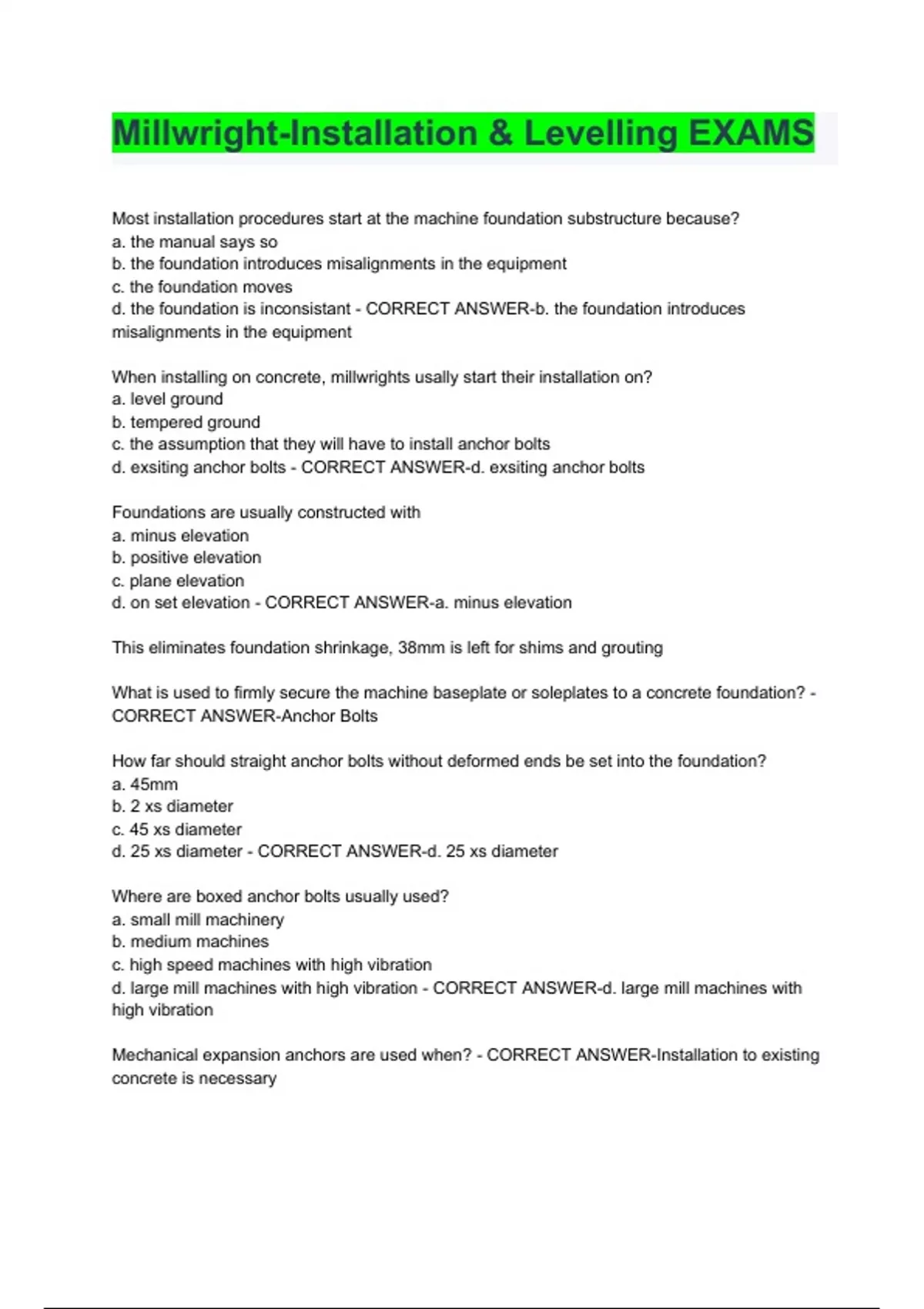 Millwright-Installation & Levelling Exam Questions and Answers 2023 with complete solution Most installation procedures start at the machine foundation substructure because? a. the manual says so b. the foundation introduces misalignments in the equipment c. the foundation moves d. the foundation is inconsistant - CORRECT ANSWER-b. the foundation introduces misalignments in the equipment When installing on concrete, millwrights usally start their installation on? a. level ground b. tempered ground c. the assumption that they will have to install anchor bolts d. exsiting anchor bolts - CORRECT ANSWER-d. exsiting anchor bolts