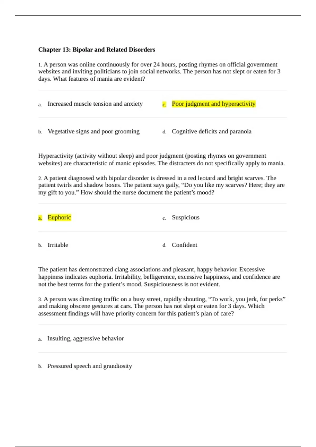: Bipolar and Related DisordersChapter 13: Bipolar and Related Disorders 1. A person was online continuously for over 24 hours, posting rhymes on official government websites and inviting politicians to join social networks. The person has not slept or eaten for 3 days. What features of mania are evident? a. Increased muscle tension and anxiety c. Poor judgment and hyperactivity b. Vegetative signs and poor grooming d. Cognitive deficits and paranoia Hyperactivity (activity without sleep) and poor judgment (posting rhymes on government websites) are characteristic of manic episodes. The distracters do not specifically apply to mania. 2. A patient diagnosed with bipolar disorder is dressed in a red leotard and bright scarves. The patient twirls and shadow boxes. The patient says gaily, “Do you like my scarves? Here; they are my gift to you.” How should the nurse document the patient’s mood? a. Euphoric c. Suspicious b. Irritable d. Confident The patient has demonstrated clang associations and pleasant, happy behavior. Excessive happiness indicates euphoria. Irritability, belligerence, excessive happiness, and confidence are not the best terms for the patient’s mood. Suspiciousness is not evident. 3. A person was directing traffic on a busy street, rapidly shouting, “To work, you jerk, for perks” and making obscene gestures at cars. The person has not slept or eaten for 3 days. Which assessment findings will have priority concern for this patient’s plan of care? a. Insulting, aggressive behavior b. Pressured speech and grandiosity c. Hyperactivity; not eating and sleeping d. Poor concentration and decision making Hyperactivity, poor nutrition, hydration, and not sleeping take priority in terms of the needs listed above because they threaten the physical integrity of the patient. The other behaviors are less threatening to the patient’s life. 4. A patient diagnosed with acute mania has distributed pamphlets about a new business venture on a street corner for 2 days. Which nursing diagnosis has priority? a. Risk for injury b. Ineffective coping c. Impaired social interaction d. Ineffective therapeutic regimen management Although each of the nursing diagnoses listed is appropriate for a patient having a manic episode, the priority lies with the patient’s physiological safety. Hyperactivity and poor judgment put the patient at risk for injury. 5. A patient diagnosed with bipolar disorder becomes hyperactive after discontinuing lithium. The patient threatens to hit another patient. Which comment by the nurse is appropriate? a. “Stop that! No one did anything to provoke an attack by you.” b. “If you do that one more time, you will be secluded immediately.” c. “Do not hit anyone. If you are unable to control yourself, we will help you.” d. “You know we will not let you hit anyone. Why do you continue this behavior?” When the patient is unable to control his or her behavior and violates or threatens to violate the rights of others, limits must be set in an effort to de-escalate the situation. Limits should be set in simple, concrete terms. The incorrect responses do not offer appropriate assistance to the patient, threaten the patient with seclusion as punishment, and ask a rhetorical question. 6. This nursing diagnosis applies to a patient with acute mania: Imbalanced nutrition: less than body requirements related to insufficient caloric intake and hyperactivity as evidenced by 5- pound weight loss in 4 days.Select an appropriate outcome. The patient will: a. ask staff for assistance with feeding within 4 days. b. drink six servings of a high-calorie, high-protein drink each day. c. consistently sit with others for at least 30 minutes at meal time within 1 week. d. consistently wear appropriate attire for age and sex within 1 week while on the psychiatric unit. High-calorie, high-protein food supplements will provide the additional calories needed to offset the patient’s extreme hyperactivity. Sitting with others or asking for assistance does not mean the patient ate or drank. The other indicator is unrelated to the nursing diagnosis. 7. A patient demonstrating characteristics of acute mania relapsed after discontinuing lithium. New orders are written to resume lithium twice daily and begin olanzapine (Zyprexa). What is the rationale for the addition of olanzapine to the medication regimen? It will: a. minimize the side effects of lithium. b. bring hyperactivity under rapid control. c. enhance the antimanic actions of lithium. d. be used for long-term control of hyperactivity. Manic symptoms are controlled by lithium only after a therapeutic serum level is attained. Because this takes several days to accomplish, a drug with rapid onset is necessary to reduce the hyperactivity initially. Antipsychotic drugs neither enhance lithium’s antimanic activity nor minimize the side effects. Lithium will be used for long-term control. 8. A patient diagnosed with bipolar disorder has rapidly changing mood cycles. The health care provider prescribes an anticonvulsant medication. To prepare teaching materials, which drug should the nurse anticipate will be prescribed? a. phenytoin (Dilantin) c. risperidone (Risperdal) b. clonidine (Catapres) d. carbamazepine (Tegretol) Some patients with bipolar disorder, especially those who have only short periods between episodes, have a favorable response to the anticonvulsants carbamazepine and valproate. Carbamazepine seems to work better in patients with rapid cycling and in severely paranoid, angry manic patients. Phenytoin is also an anticonvulsant but not used for mood stabilization. Risperidone is not an anticonvulsant. See relationship to audience response question. 9. The exact cause of bipolar disorder has not been determined; however, for most patients: a. several factors, including genetics, are implicated. b. brain structures were altered by stress early in life. c. excess sensitivity in dopamine receptors may trigger epis