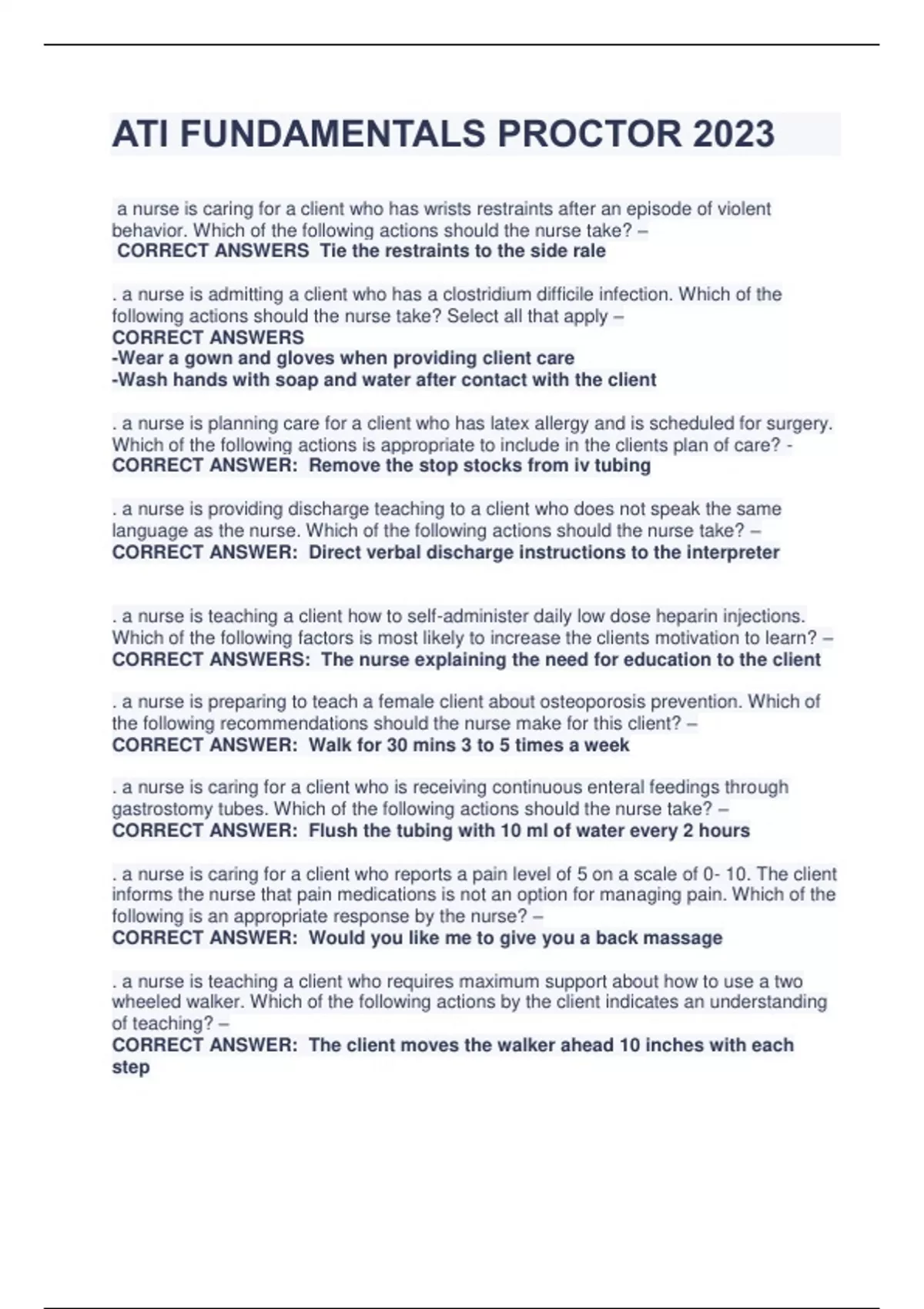 ATI FUNDAMENTALS PROCTOR 2023 a nurse is caring for a client who has wrists restraints after an episode of violent behavior. Which of the following actions should the nurse take? – CORRECT ANSWERS Tie the restraints to the side rale . a nurse is admitting a client who has a clostridium difficile infection. Which of the following actions should the nurse take? Select all that apply – CORRECT ANSWERS -Wear a gown and gloves when providing client care -Wash hands with soap and water after contact with the client . a nurse is planning care for a client who has latex allergy and is scheduled for surgery. Which of the following actions is appropriate to include in the clients plan of care? - CORRECT ANSWER: Remove the stop stocks from iv tubing . a nurse is providing discharge teaching to a client who does not speak the same language as the nurse. Which of the following actions should the nurse take? – CORRECT ANSWER: Direct verbal discharge instructions to the interpreter . a nurse is teaching a client how to self-administer daily low dose heparin injections. Which of the following factors is most likely to increase the clients motivation to learn? – CORRECT ANSWERS: The nurse explaining the need for education to the client . a nurse is preparing to teach a female client about osteoporosis prevention. Which of the following recommendations should the nurse make for this client? – CORRECT ANSWER: Walk for 30 mins 3 to 5 times a week . a nurse is caring for a client who is receiving continuous enteral feedings through gastrostomy tubes. Which of the following actions should the nurse take? – CORRECT ANSWER: Flush the tubing with 10 ml of water every 2 hours . a nurse is caring for a client who reports a pain level of 5 on a scale of 0- 10. The client informs the nurse that pain medications is not an option for managing pain. Which of the following is an appropriate response by the nurse? – CORRECT ANSWER: Would you like me to give you a back massage . a nurse is teaching a client who requires maximum support about how to use a two wheeled walker. Which of the following actions by the client indicates an understanding of teaching? – CORRECT ANSWER: The client moves the walker ahead 10 inches with each step