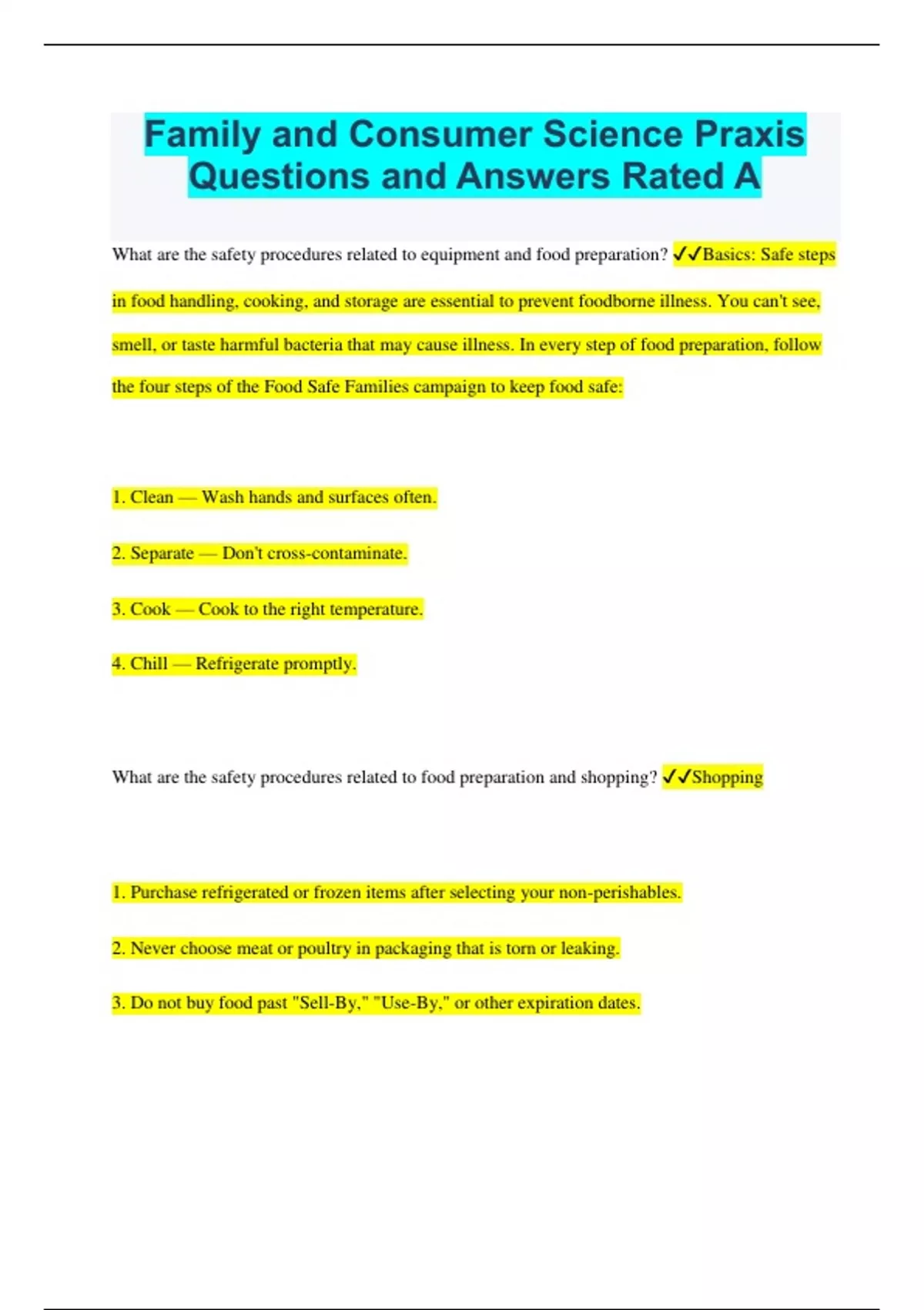 Family and Consumer Science Praxis Questions and Answers Rated A What are the safety procedures related to equipment and food preparation? Basics: Safe steps in food handling, cooking, and storage are essential to prevent foodborne illness. You can't see, smell, or taste harmful bacteria that may cause illness. In every step of food preparation, follow the four steps of the Food Safe Families campaign to keep food safe: 1. Clean — Wash hands and surfaces often. 2. Separate — Don't cross-contaminate. 3. Cook — Cook to the right temperature. 4. Chill — Refrigerate promptly. What are the safety procedures related to food preparation and shopping? Shopping 1. Purchase refrigerated or frozen items after selecting your non-perishables. 2. Never choose meat or poultry in packaging that is torn or leaking. 3. Do not buy food past "Sell-By," "Use-By," or other expiration dates. What are the safety procedures related to food preparation and storage? 1. Always refrigerate perishable food within 2 hours—1 hour when the temperature is above 90 °F (32.2 ºC). 2. Check the temperature of your refrigerator and freezer with an appliance thermometer. The refrigerator should be at 40 °F (4.4 ºC) or below and the freezer at 0 °F (-17.7 ºC) or below. 3. Cook or freeze fresh poultry, fish, ground meats, and variety meats within 2 days; other beef, veal, lamb, or pork, within 3 to 5 days. 4. Perishable food such as meat and poultry should be wrapped securely to maintain quality and to prevent meat juices from getting onto other food. 5. To maintain quality when freezing meat and poultry in its original package, wrap the package again with foil or plastic wrap that is recommended for the freezer. 6. Canned foods are safe indefinitely as long as they are not exposed to freezing temperatures, or temperatures above 90 °F. If the cans look ok, they are safe to use. 7. Discard cans that are dented, rusted, or swollen. High-acid canned food (tomatoes, fruits) will keep their best quality for 12 to 18 months; low-acid canned food (meats, vegetables) for 2 to 5 years. What are the safety procedures related to food preparation? Preparation 1. Always wash hands with warm water and soap for 20 seconds before and after handling food. 2. Don't cross-contaminate. Keep raw meat, poultry, fish, and their juices away from other food. 3. After cutting raw meats, wash cutting board, utensils, and countertops with hot, soapy water. 4. Cutting boards, utensils, and countertops can be sanitized by using a solution of 1 tablespoon of unscented, liquid chlorine bleach in 1 gallon of water. 5. Marinate meat and poultry in a covered dish in the refrigerator. What are the safety procedures related to food preparation and thawing? 1. Refrigerator: The refrigerator allows slow, safe thawing. Make sure thawing meat and poultry juices do not drip onto other food. 2. Cold Water: For faster thawing, place food in a leak-proof plastic bag. Submerge in cold tap water. Change the water every 30 minutes. Cook immediately after thawing. 3. Microwave: Cook meat and poultry immediately after microwave thawing. What are the safety procedures related to food preparation and cooking? 1. Cook all raw beef, pork, lamb and veal steaks, chops, and roasts to a minimum internal temperature of 145 °F (62.8 ºC) as measured with a food thermometer before removing meat from the heat source. For safety and quality, allow meat to rest for at least three minutes before carving or consuming. For reasons of personal preference, consumers may choose to cook meat to higher temperatures. 2. Ground meats: Cook all raw ground beef, pork, lamb, and veal to an internal temperature of 160 °F (71.1 ºC) as measured with a food thermometer. 3. Poultry: Cook all poultry to an internal temperature of 165 °F (73.9 °C) as measured with a food thermometer. What are the safety procedures related to food preparation and serving? 1. Hot food should be held at 140 °F (60 °C) or warmer. 2. Cold food should be held at 40 °F (4.4 ºC) or colder. 3. When serving food at a buffet, keep food hot with chafing dishes, slow cookers, and warming trays. Keep food cold by nesting dishes in bowls of ice or use small serving trays and replace them often. 4. Perishable food should not be left out more than 2 hours at room temperature—1 hour when the temperature is above 90 °F (32.2 ºC). What