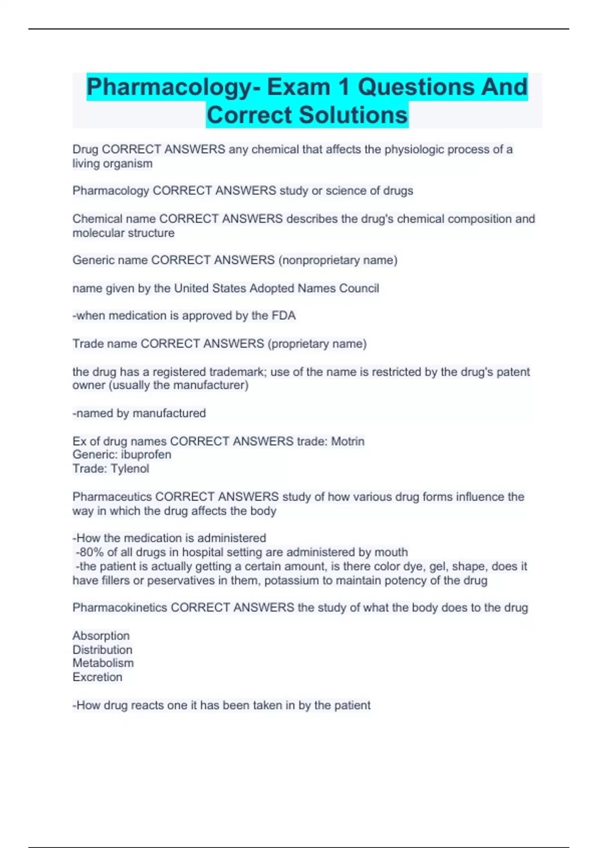 Pharmacology- Exam 1 Questions And Correct Solutions