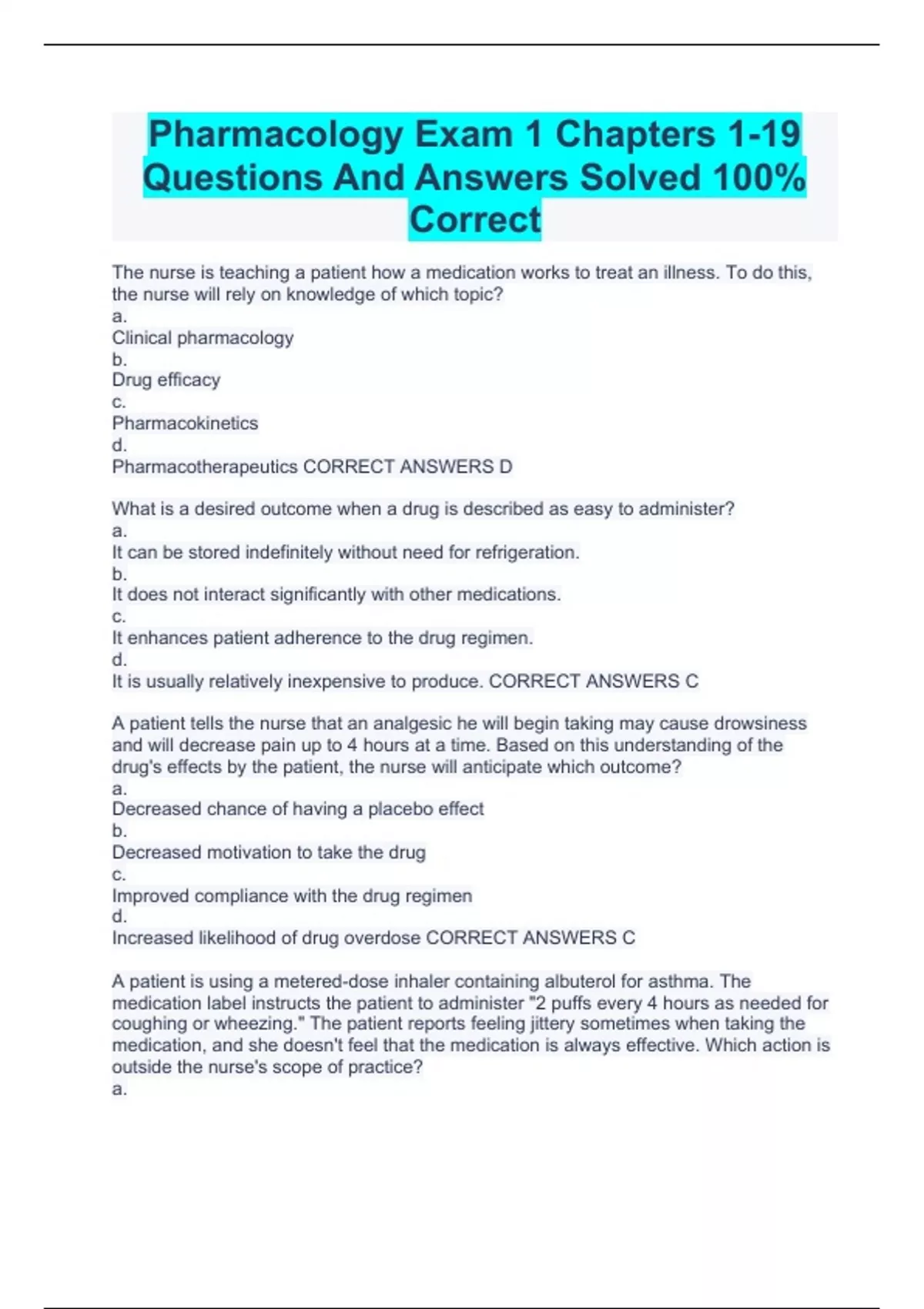 Pharmacology Exam 1 Chapters 1-19 Questions And Answers Solved 100% Correct