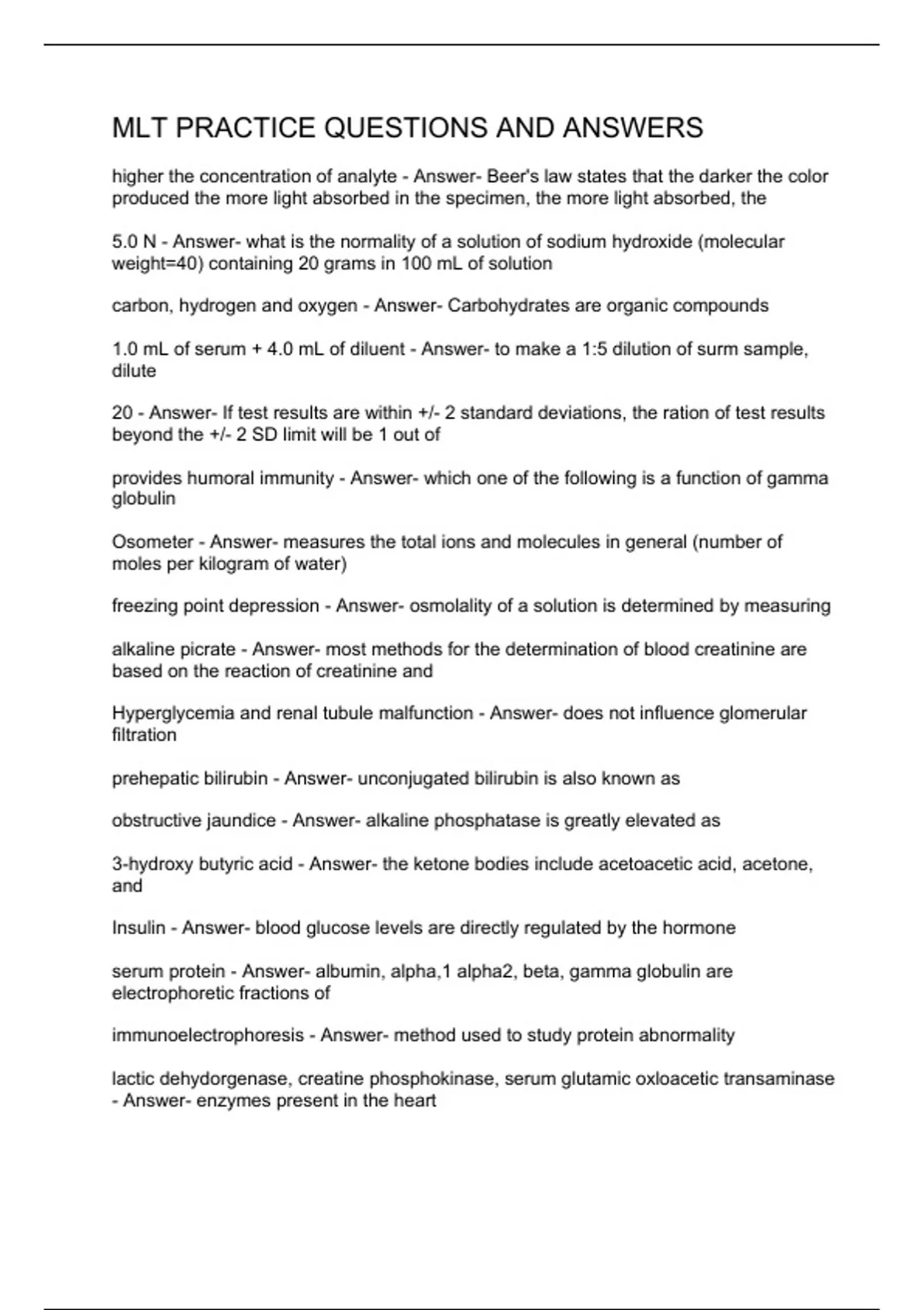 higher the concentration of analyte - Answer- Beer's law states that the darker the color produced the more light absorbed in the specimen, the more light absorbed, the 5.0 N - Answer- what is the normality of a solution of sodium hydroxide (molecular weight=40) containing 20 grams in 100 mL of solution carbon, hydrogen and oxygen - Answer- Carbohydrates are organic compounds 1.0 mL of serum + 4.0 mL of diluent - Answer- to make a 1:5 dilution of surm sample, dilute 20 - Answer- If test results are within +/- 2 standard deviations, the ration of test results beyond the +/- 2 SD limit will be 1 out of provides humoral immunity - Answer- which one of the following is a function of gamma globulin Osometer - Answer- measures the total ions and molecules in general (number of moles per kilogram of water) freezing point depression - Answer- osmolality of a solution is determined by measuring alkaline picrate - Answer- most methods for the determination of blood creatinine are based on the reaction of creatinine and Hyperglycemia and renal tubule malfunction - Answer- does not influence glomerular filtration prehepatic bilirubin - Answer- unconjugated bilirubin is also known as obstructive jaundice - Answer- alkaline phosphatase is greatly elevated as 3-hydroxy butyric acid - Answer- the ketone bodies include acetoacetic acid, acetone, and Insulin - Answer- blood glucose levels are directly regulated by the hormone