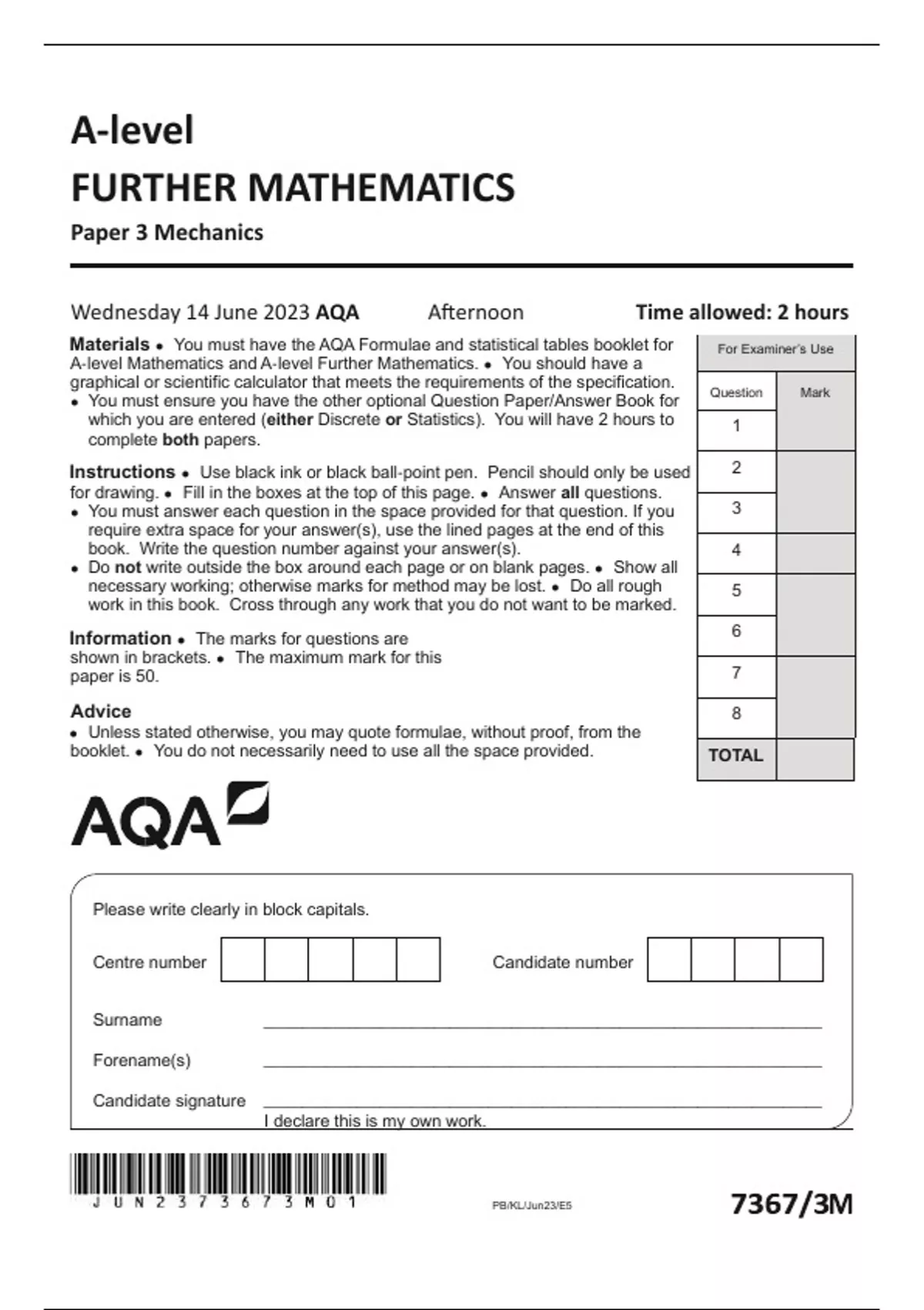 AQA A-level FURTHER MATHEMATICS Paper 3 Mechanics 7367-3M-QP-Mathematics-A-14Jun23