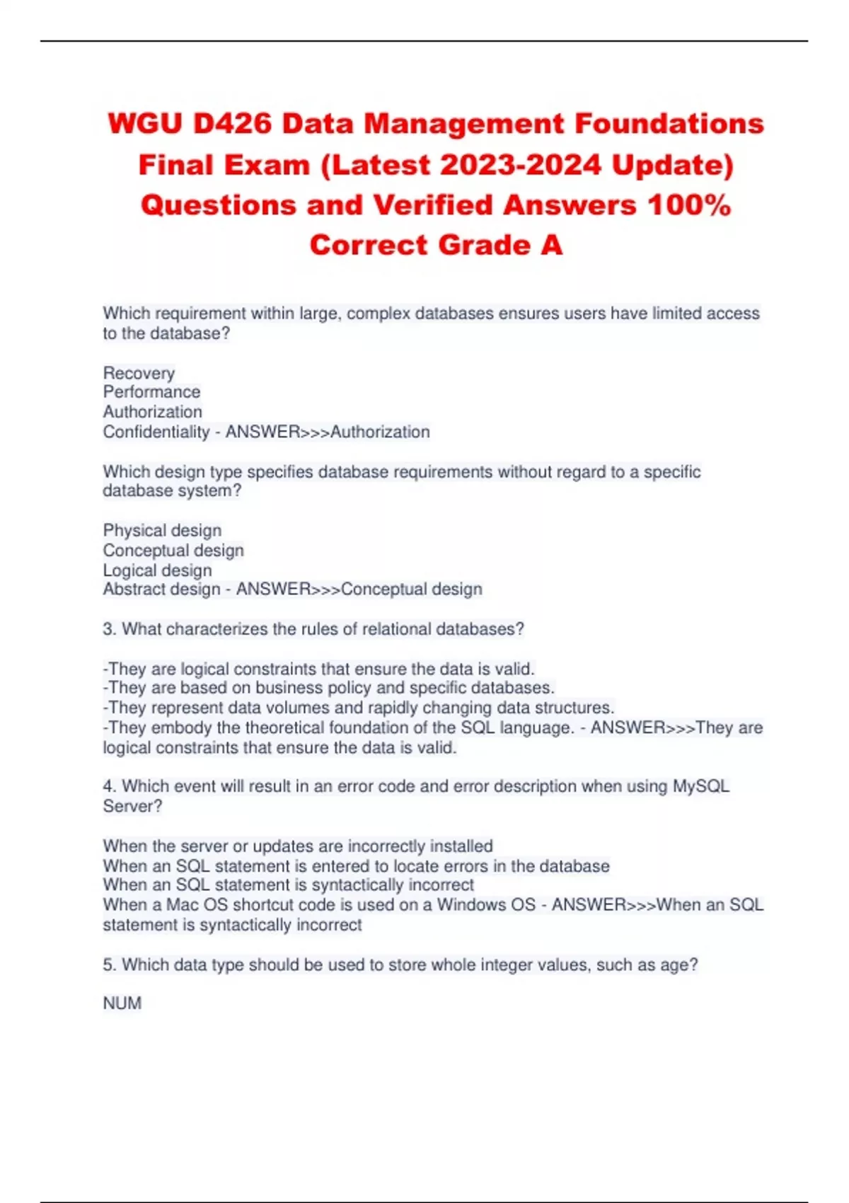 WGU D426 Data Management Foundations Final Exam (Latest Update) Questions and Verified Answers 100% Correct Grade A