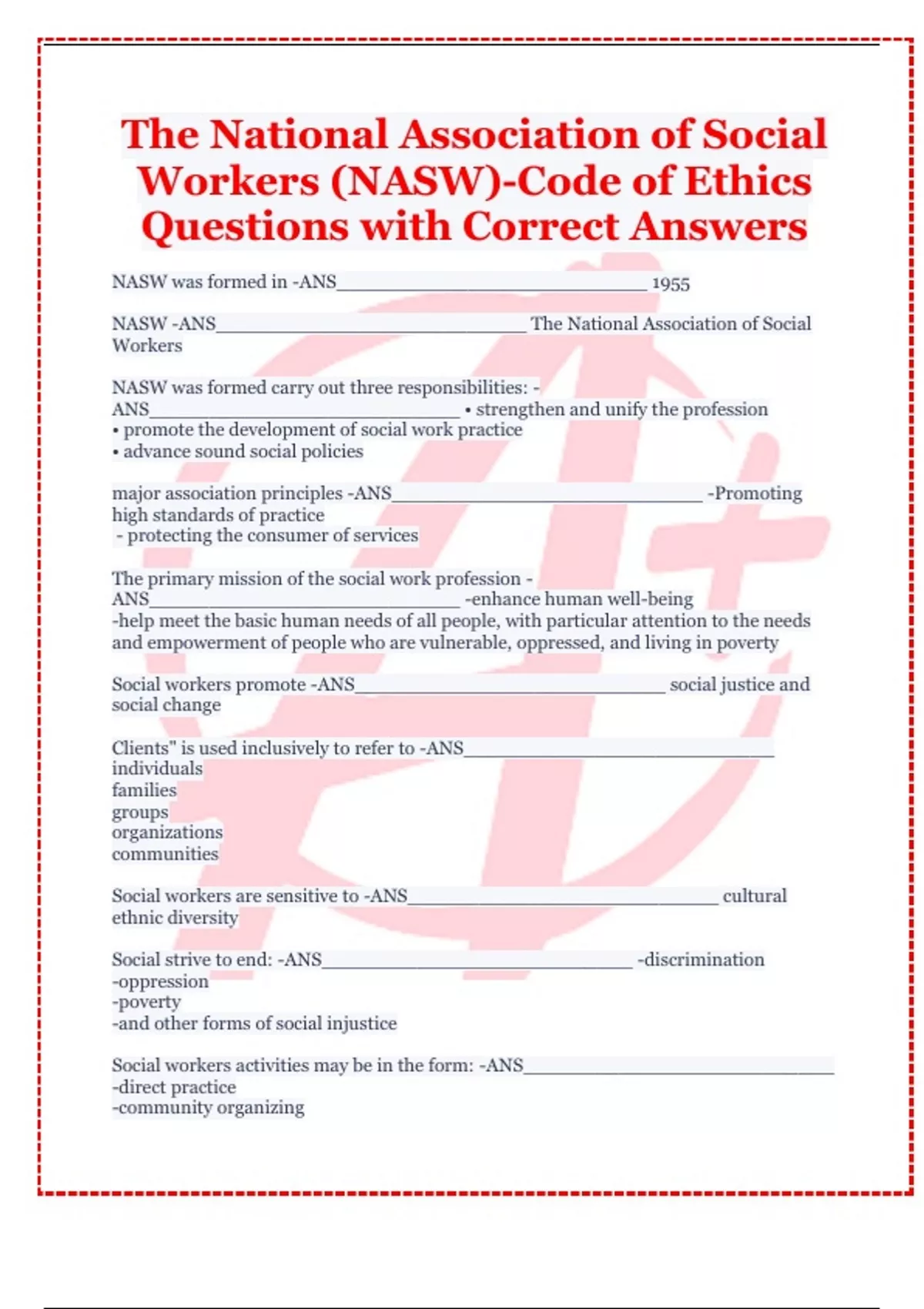 The National Association of Social Workers (NASW)-Code of Ethics Questions with Correct Answers