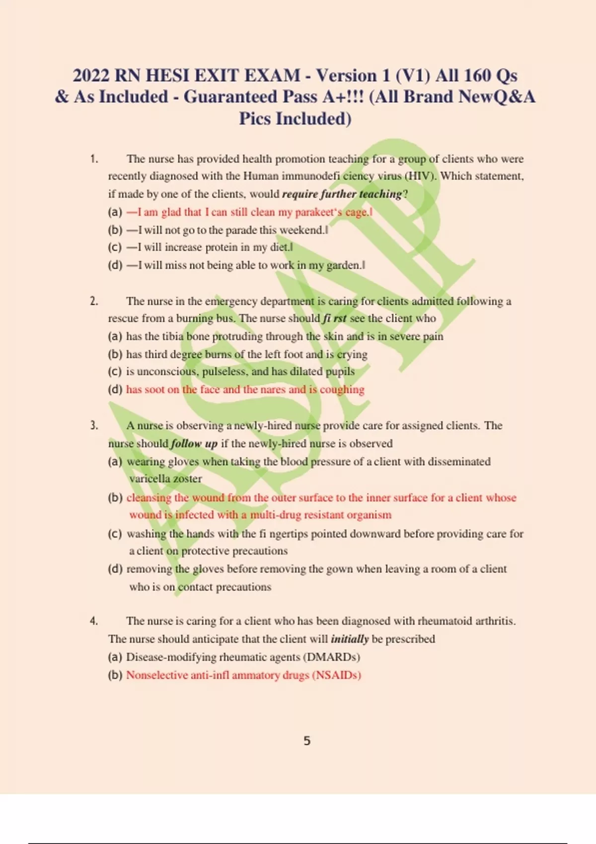 2022 RN HESI EXIT EXAM - Version 1 (V1) All 160 Qs & As Included - Guaranteed Pass A+!!! (All Brand NewQ&A Pics Included) 1. The nurse has provided health promotion teaching for a group of clients who were recently diagnosed with the Human immunodefi ciency virus (HIV). Which statement, if made by one of the clients, would require further teaching? (a) ―I am glad that I can still clean my parakeet‘s cage.‖ (b) ―Iwill not go to the parade this weekend.‖ (c) ―I will increase protein in my diet.‖ (d) ―Iwill miss not being able to work in my garden.‖ 2. The nurse in the emergency department is caring for clients admitted following a rescue from a burning bus. The nurse should fi rst see the client who (a) has the tibia bone protruding through the skin and is in severe pain (b) has third degree burns of the left foot and is crying (c) is unconscious, pulseless, and has dilated pupils (d) has soot on the face and the nares and is coughing 3. A nurse is observing a newly-hired nurse provide care for assigned clients. The nurse should follow up if the newly-hired nurse is observed (a) wearing gloves when taking the blood pressure of a client with disseminated varicella zoster (b) cleansing the wound from the outer surface to the inner surface for a client whose wound is infected with a multi-drug resistant organism (c) washing the hands with the fi ngertips pointed downward before providing care for a client on protective precautions (d) removing the gloves before removing the gown when leaving a room of a client who is on contact precautions 4. The nurse is caring for a client who has been diagnosed with rheumatoid arthritis. The nurse should anticipate that the client will initially be prescribed (a) Disease-modifying rheumatic agents (DMARDs) (b) Nonselective anti-infl ammatory drugs (NSAIDs) 6 (c) Long-term corticosteroids (d) Biologic Response Modifi ers 5. The nurse is assessing a 2-month-old-infant at a well baby cl