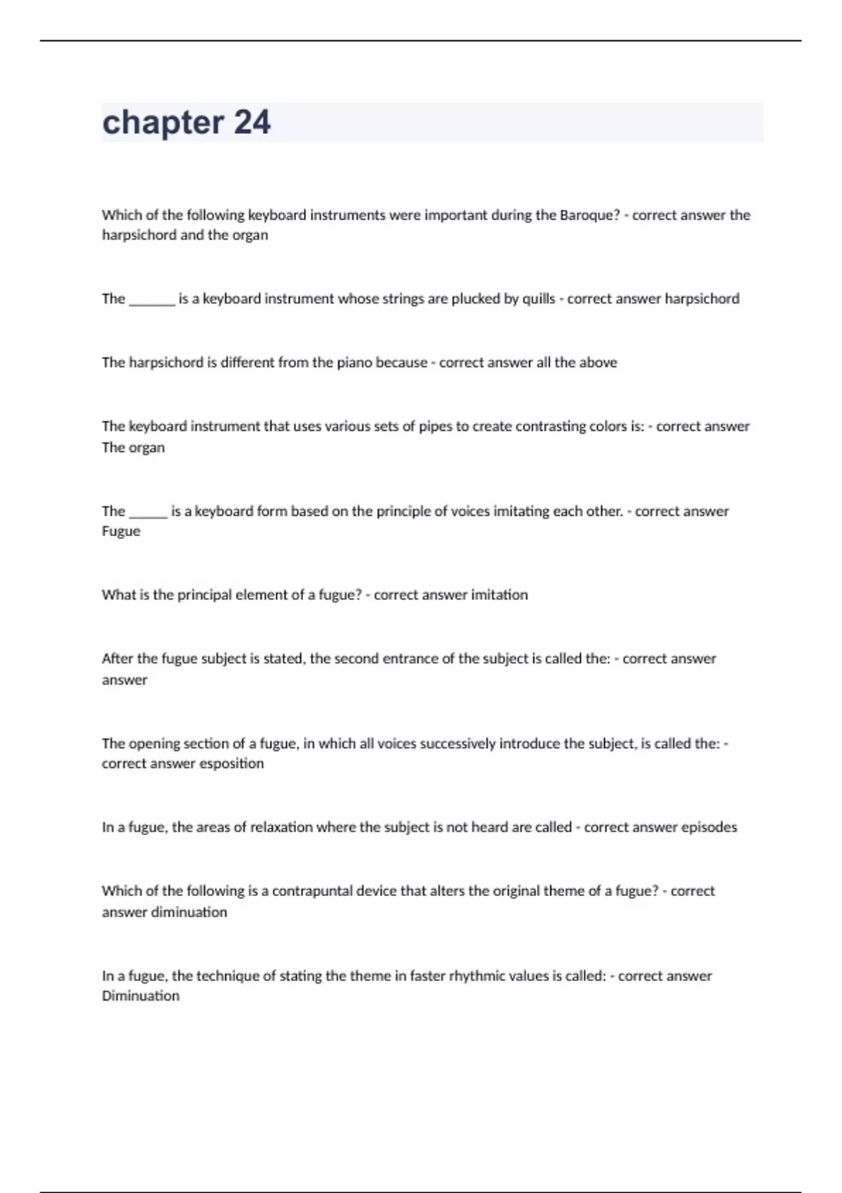 chapter 24Which of the following keyboard instruments were important during the Baroque? - correct answer the harpsichord and the organ The ______ is a keyboard instrument whose strings are plucked by quills - correct answer harpsichord The harpsichord is different from the piano because - correct answer all the above The keyboard instrument that uses various sets of pipes to create contrasting colors is: - correct answer The organ The _____ is a keyboard form based on the principle of voices imitating each other. - correct answer Fugue What is the principal element of a fugue? - correct answer imitation After the fugue subject is stated, the second entrance of the subject is called the: - correct answer answer The opening section of a fugue, in which all voices successively introduce the subject, is called the: - correct answer esposition In a fugue, the areas of relaxation where the subject is not heard are called - correct answer episodes Which of the following is a contrapuntal device that alters the original theme of a fugue? - correct answer diminuation In a fugue, the technique of stating the theme in faster rhythmic values is called: - correct answer Diminuation Bach's last demonstration of contrapuntal mastery was: - correct answer The Art of Fugue The three main keyboard instruments of the Baroque were the harpsichord, organ, and piano - correct answer False The strings of a harpsichord are plucked by quills - correct answer tru The advantage of the harpsichord was its ability to produce crescendos and diminuendos - correct answer false The organ uses multiple keyboards - correct answer true A fugue is a contrapuntal composition in which a single subject is the focal point that unifies the work - correct answer tru At the beginning of a fugue, the countersubject is stated alone - correct answer false