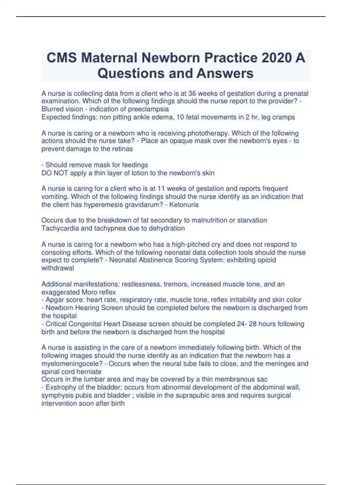 CMS Maternal Newborn Practice 2020 A Questions and Answers