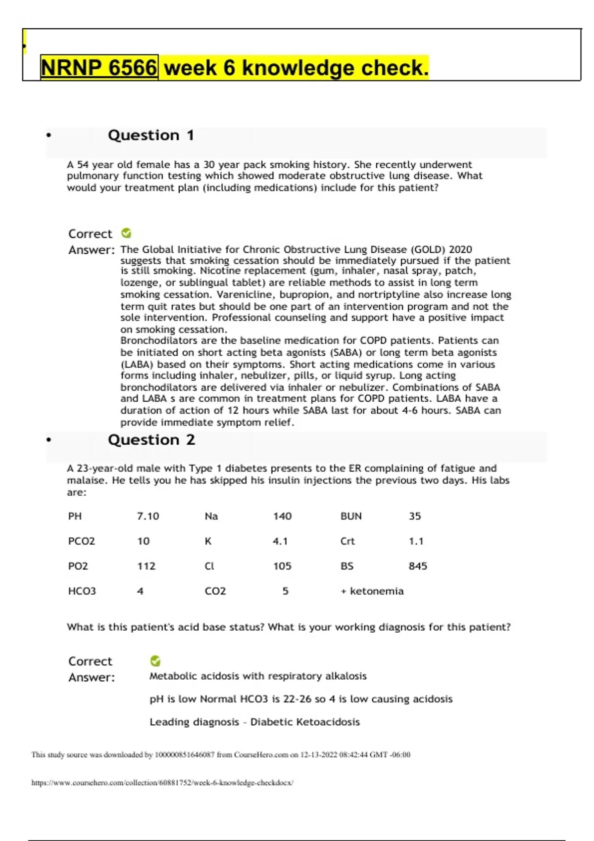 • NRNP 6566 week 6 knowledge check. A 54 year old female has a 30 year pack smoking history. She recently underwent pulmonary function testing which showed moderate obstructive lung disease. What would your treatment plan (including medications) include for this patient? Correct Answer: The Global Initiative for Chronic Obstructive Lung Disease (GOLD) 2020 suggests that smoking cessation should be immediately pursued if the patient is still smoking. Nicotine replacement (gum, inhaler, nasal spray, patch, lozenge, or sublingual tablet) are reliable methods to assist in long term smoking cessation. Varenicline, bupropion, and nortriptyline also increase long term quit rates but should be one part of an intervention program and not the sole intervention. Professional counseling and support have a positive impact on smoking cessation. Bronchodilators are the baseline medication for COPD patients. Patients can be initiated on short acting beta agonists (SABA) or long term beta agonists (LABA) based on their symptoms. Short acting medications come in various forms including inhaler, nebulizer, pills, or liquid syrup. Long acting bronchodilators are delivered via inhaler or nebulizer. Combinations of SABA and LABA s are common in treatment plans for COPD patients. LABA have a duration of action of 12 hours while SABA last for about 4-6 hours. SABA can provide immediate symptom relief. A 23-year-old male with Type 1 diabetes presents to the ER complaining of fatigue and malaise. He tells you he has skipped his insulin injections the previous two days. His labs are: PH 7.10 Na 140 BUN 35 PCO2 10 K 4.1 Crt 1.1 PO2 112 Cl 105 BS 845 HCO3 4 CO2 5 + ketonemia What is this patient's acid base status? What is your working diagnosis for this patient? Correct Answer: Metabolic acidosis with respiratory alkalosis pH is low Normal HCO3 is 22-26 so 4 is low causing acidosis Leading diagnosis – Diabetic Ketoacidosis Anion gap is elevated at 31