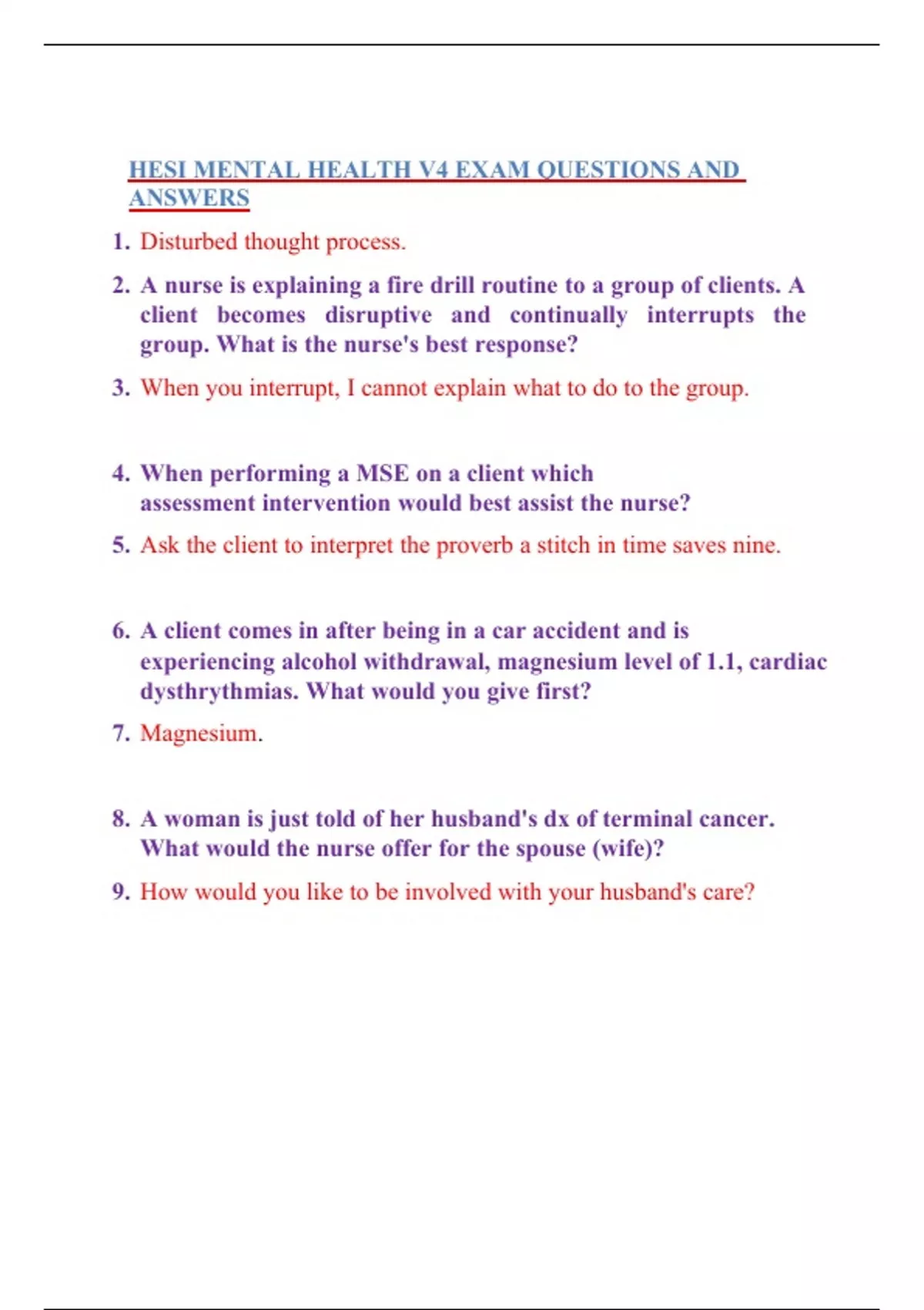 HESI MENTAL HEALTH V4 EXAM QUESTIONS AND ANSWERS 1. Disturbed thought process. 2. A nurse is explaining a fire drill routine to a group of clients. A client becomes disruptive and continually interrupts the group. What is the nurse's best response? 3. When you interrupt, I cannot explain what to do to the group. 4. When performing a MSE on a client which assessment intervention would best assist the nurse? 5. Ask the client to interpret the proverb a stitch in time saves nine. 6. A client comes in after being in a car accident and is experiencing alcohol withdrawal, magnesium level of 1.1, cardiac dysthrythmias. What would you give first? 7. Magnesium. 8. A woman is just told of her husband's dx of terminal cancer. What would the nurse offer for the spouse (wife)? 9. How would you like to be involved with your husband's care? 10. A nurse is to remove staples from an abdominal incision, the client is very anxious. What is the most important intervention? 11. Attempt to distract the client with general conversation. 12. A man who was stranded on the roof of his house for two days after a natural disaster, months later ... 13. Implement anxiety control strategies 14. A man dx with bipolar disorder states, "I don't understand, I believe in God and have not done anything to deserve this". What is the nurse's best response? 15. You didn't do anything wrong. You have a chemical imbalance in your brain. 16. A client becomes upset when the nurse he requests is not assigned to him, what is the nurse's best response? 17. Advise the client that nursing assignments are not based on client requests. 18. A client needs to wash her hands for two hours before able to go on with her morning. She doesn't want to sit on the chairs in the dayroom for fear of getting dirty. What is this mechanism? 19. Compulsion. 20. A client in group is talking about her prostitution, the nurse asks her if she was abused by her parents. She states "my mother ran my father out when I was young". What defense mechanism was used? 21. Repression. 22. A woman calls the crisis hotline and says she has a loaded gun and is going to kill herself. To maintain patient confidentiality what would the nurse do? 23. Contact the person the client chooses to go to the home and remove the weapon. 24. A client with anger management issues uses belt making and bangs the leather heavily. What defense mechanisms is being used? 25. Sublimation. 26. A bipolar client comes into the clinic and tells the nurse that the next time she sees her sister I'm going to kill her. What should the nurse do? 27. Inform the sister. 28. What would be the nurse's highest priority for a newly admitted depressed client upon admission? 29. The nurse should go through the client's belongings. 30. Who is most prone to being abused (elder abuse)?