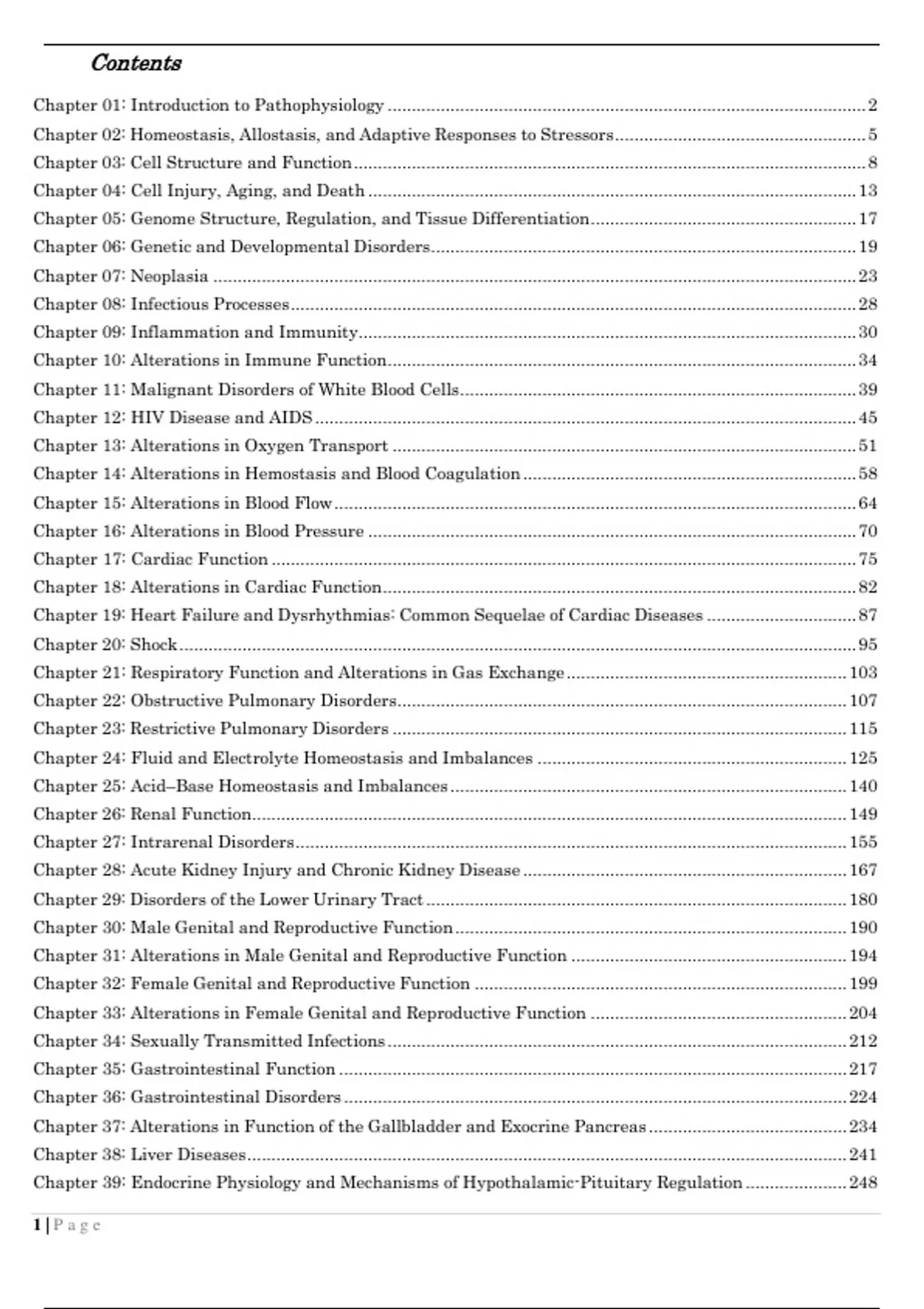 Test Bank Pathophysiology 7th Edition BanasikContents Chapter 01: Introduction to Pathophysiology ................................................................................................... 2 Chapter 02: Homeostasis, Allostasis, and Adaptive Responses to Stressors .................................................... 5 Chapter 03: Cell Structure and Function .......................................................................................................... 8 Chapter 04: Cell Injury, Aging, and Death ..................................................................................................... 13 Chapter 05: Genome Structure, Regulation, and Tissue Differentiation ....................................................... 17 Chapter 06: Genetic and Developmental Disorders ........................................................................................ 19 Chapter 07: Neoplasia ..................................................................................................................................... 23 Chapter 08: Infectious Processes ..................................................................................................................... 28 Chapter 09: Inflammation and Immunity ....................................................................................................... 30 Chapter 10: Alterations in Immune Function ................................................................................................. 34 Chapter 11: Malignant Disorders of White Blood Cells .................................................................................. 39 Chapter 12: HIV Disease and AIDS ................................................................................................................ 45 Chapter 13: Alterations in Oxygen Transport ................................................................................................ 51 Chapter 14: Alterations in Hemostasis and Blood Coagulation ..................................................................... 58 Chapter 15: Alterations in Blood Flow ............................................................................................................ 64 Chapter 16: Alterations in Blood Pressure ..................................................................................................... 70 Chapter 17: Cardiac Function ......................................................................................................................... 75 Chapter 18: Alterations in Cardiac Function .................................................................................................. 82 Chapter 19: Heart Failure and Dysrhythmias: Common Sequelae of Cardiac Diseases ............................... 87 Chapter 20: Shock ............................................................................................................................................ 95 Chapter 21: Respiratory Function and Alterations in Gas Exchange .......................................................... 103 Chapter 22: Obstructive Pulmonary Disorders ............................................................................................. 107 Chapter 23: Restrictive Pulmonary Disorders .............................................................................................. 115 Chapter 24: Fluid and Electrolyte Homeostasis and Imbalances ................................................................ 125 Chapter 25: Acid–Base Homeostasis and Imbalances .................................................................................. 140 Chapter 26: Renal Function ........................................................................................................................... 149 Chapter 27: Intrarenal Disorders .................................................................................................................. 155 Chapter 28: Acute Kidney Injury and Chronic Kidney Disease ................................................................... 167 Chapter 29: Disorders of the Lower Urinary Tract ....................................................................................... 180 Chapter 30: Male Genital and Reproductive Function ................................................................................. 190 Chapter 31: Alterations in Male Genital and Reproductive Function ......................................................... 194 Chapter 32: Female Genital and Reproductive Function ............................................................................. 199 Chapter 33: Alterations in Female Genital and Reproductive Function ..................................................... 204 Chapter 34: Sexually Transmitted Infections ............................................................................................... 212 Chapter 35: Gastrointestinal Function ......................................................................................................... 217 Chapter 36: Gastrointestinal Disorders ........................................................................................................ 224 Chapter 37: Alterations in Function of the Gallbladder and Exocrine Pancreas ......................................... 234 Chapter 38: Liver Diseases ............................................................................................................................ 241 Chapter 39: Endocrine Physiology and Mechanisms of Hypothalamic-Pituitary Regulation ..................... 248 1 | P a g eChapter 40: Disorders of Endocrine Function ............................................................................................... 257 Chapter 41: Diabetes Mellitus ....................................................................................................................... 267 Chapter 42: Alterations in Metabolism and Nutrition ................................................................................. 274 Chap
