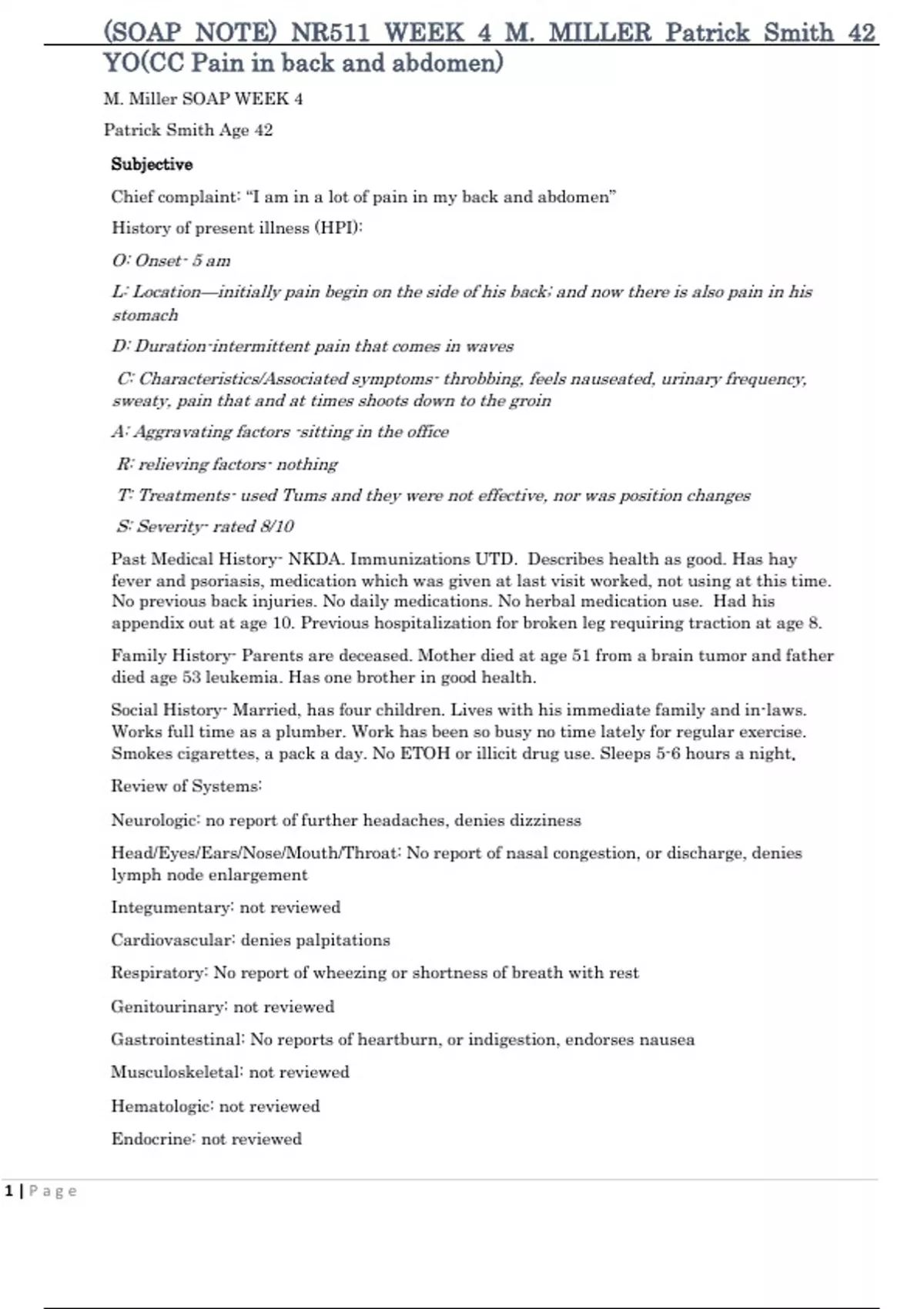 (SOAP NOTE) NR511 WEEK 4 M. MILLER Patrick Smith 42 YO(CC Pain in back and abdomen)