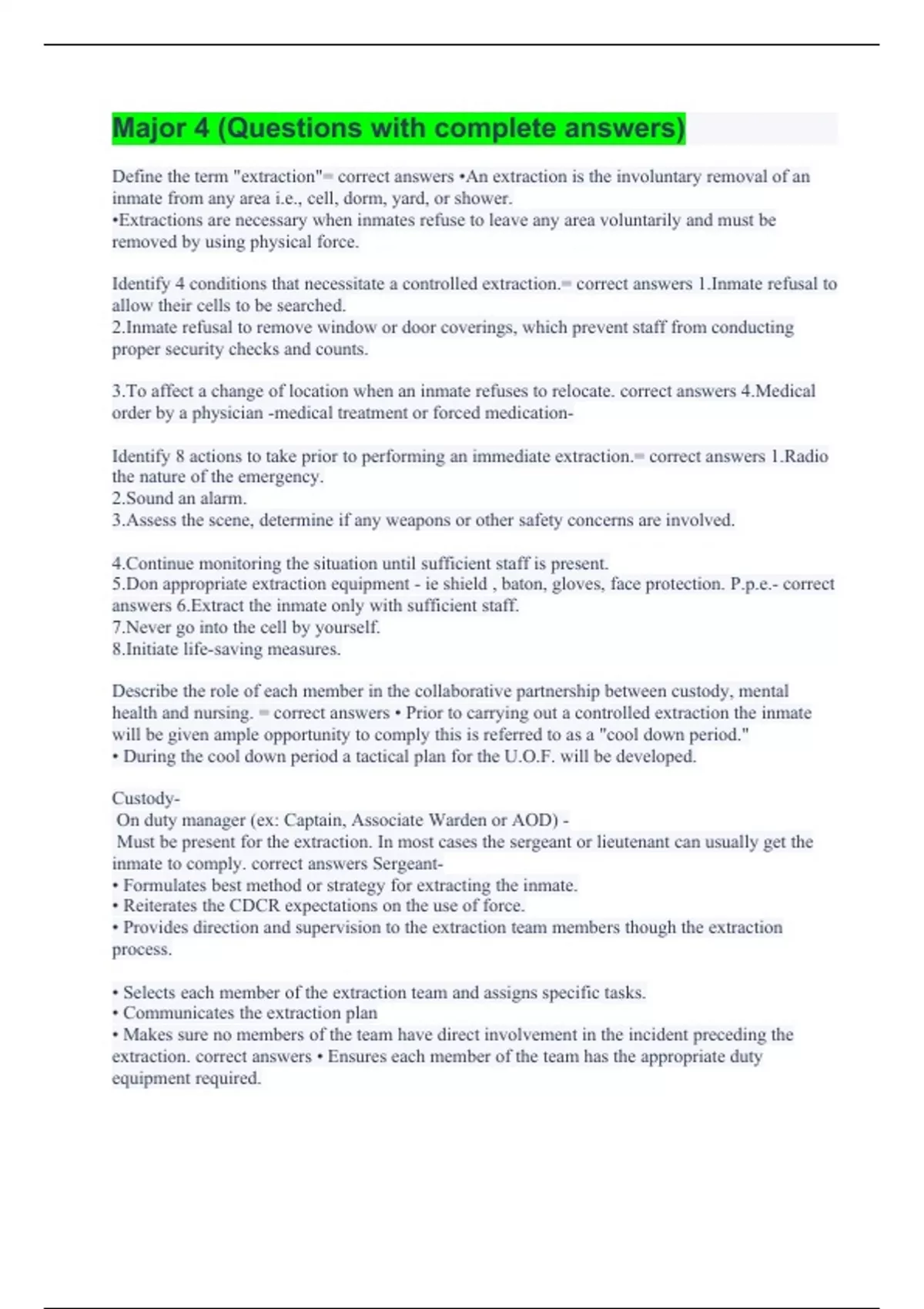 Define the term "extraction"= correct answers •An extraction is the involuntary removal of an inmate from any area i.e., cell, dorm, yard, or shower. •Extractions are necessary when inmates refuse to leave any area voluntarily and must be removed by using physical force. Identify 4 conditions that necessitate a controlled extraction.= correct answers 1.Inmate refusal to allow their cells to be searched. 2.Inmate refusal to remove window or door coverings, which prevent staff from conducting proper security checks and counts. 3.To affect a change of location when an inmate refuses to relocate. correct answers 4.Medical order by a physician -medical treatment or forced medication- Identify 8 actions to take prior to performing an immediate extraction.= correct answers 1.Radio the nature of the emergency. 2.Sound an alarm. 3.Assess the scene, determine if any weapons or other safety concerns are involved. 4.Continue monitoring the situation until sufficient staff is present. 5.Don appropriate extraction equipment - ie shield , baton, gloves, face protection. P.p.e.- correct answers 6.Extract the inmate only with sufficient staff. 7.Never go into the cell by yourself. 8.Initiate life-saving measures. Describe the role of each member in the collaborative partnership between custody, mental health and nursing. = correct answers • Prior to carrying out a controlled extraction the inmate will be given ample opportunity to comply this is referred to as a "cool down period." • During the cool down period a tactical plan for the U.O.F. will be developed. Custody- On duty manager (ex: Captain, Associate Warden or AOD) - Must be present for the extraction. In most cases the sergeant or lieutenant can usually get the inmate to comply. correct answers Sergeant- • Formulates best method or strategy for extracting the inmate. • Reiterates the CDCR expectations on the use of force. • Provides direction and supervision to the extraction team members though the extraction process. • Selects each member of the extraction team and assigns specific tasks. • Communicates the extraction plan • Makes sure no members of the team have direct involvement in the incident preceding the extraction. correct answers • Ensures each member of the team has the appropriate duty equipment required.