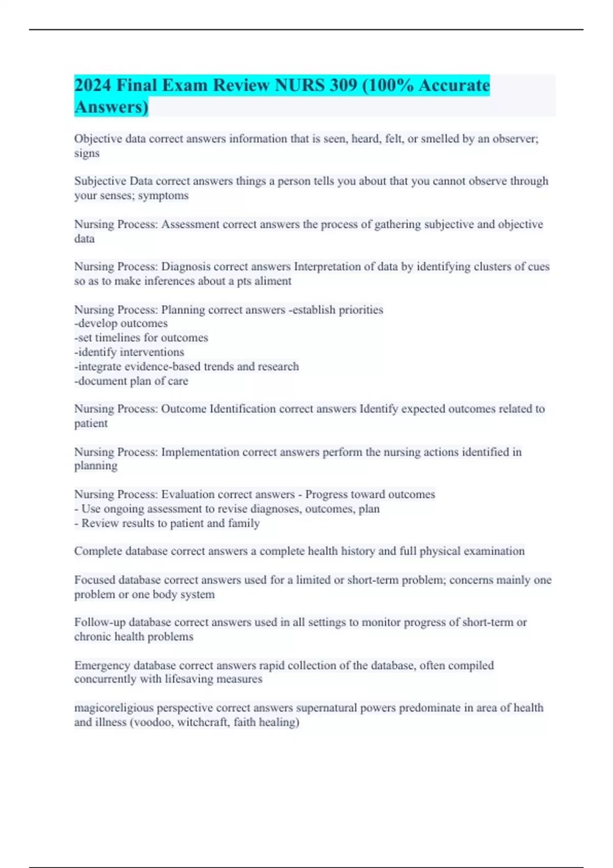 Objective data correct answers information that is seen, heard, felt, or smelled by an observer; signs Subjective Data correct answers things a person tells you about that you cannot observe through your senses; symptoms Nursing Process: Assessment correct answers the process of gathering subjective and objective data Nursing Process: Diagnosis correct answers Interpretation of data by identifying clusters of cues so as to make inferences about a pts aliment Nursing Process: Planning correct answers -establish priorities -develop outcomes -set timelines for outcomes -identify interventions -integrate evidence-based trends and research -document plan of care Nursing Process: Outcome Identification correct answers Identify expected outcomes related to patient Nursing Process: Implementation correct answers perform the nursing actions identified in planning Nursing Process: Evaluation correct answers - Progress toward outcomes - Use ongoing assessment to revise diagnoses, outcomes, plan - Review results to patient and family Complete database correct answers a complete health history and full physical examination Focused database correct answers used for a limited or short-term problem; concerns mainly one problem or one body system Follow-up database correct answers used in all settings to monitor progress of short-term or chronic health problems Emergency database correct answers rapid collection of the database, often compiled concurrently with lifesaving measures magicoreligious perspective correct answers supernatural powers predominate in area of health and illness (voodoo, witchcraft, faith healing)