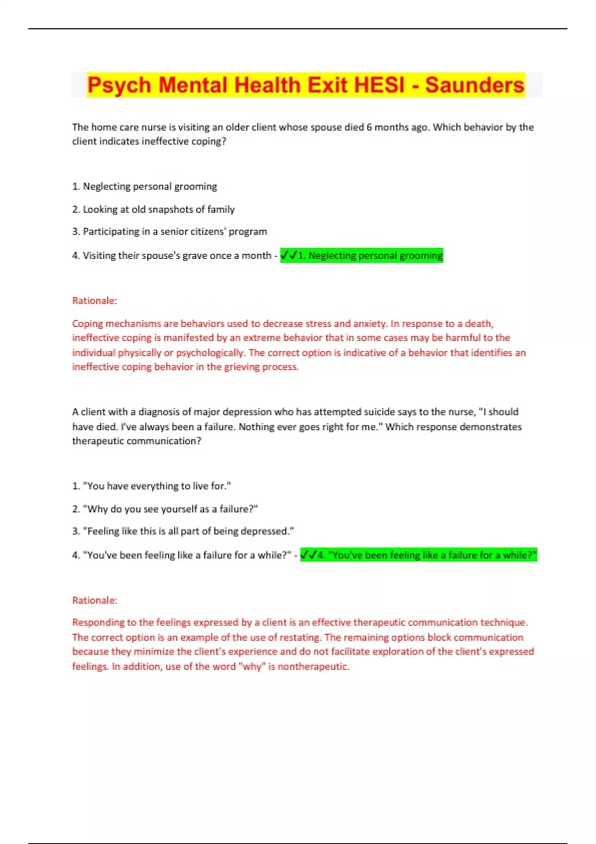 Psych Mental Health Exit HESI - Saunders | Questions with 100% Correct Answers | Latest Update 2024 | Verified