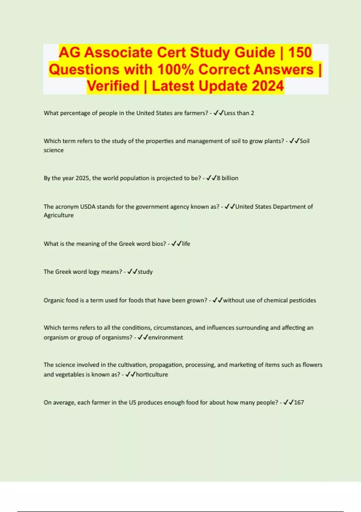 AG Associate Cert Study Guide | 150 Questions with 100% Correct Answers | Verified | Latest Update 2024