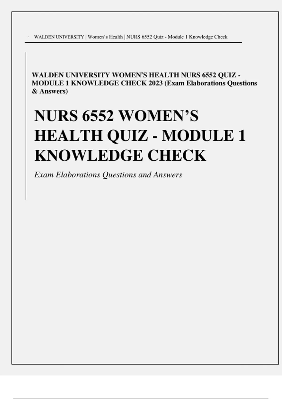 WALDEN UNIVERSITY WOMEN’S HEALTH NURS 6552 QUIZ - MODULE 1 KNOWLEDGE CHECK 2023 (Exam Elaborations Questions & Answers) Latest Verified Review 2023 Practice Questions and Answers for Exam Preparation, 100% Correct with Explanations, Highly Recommended, Do