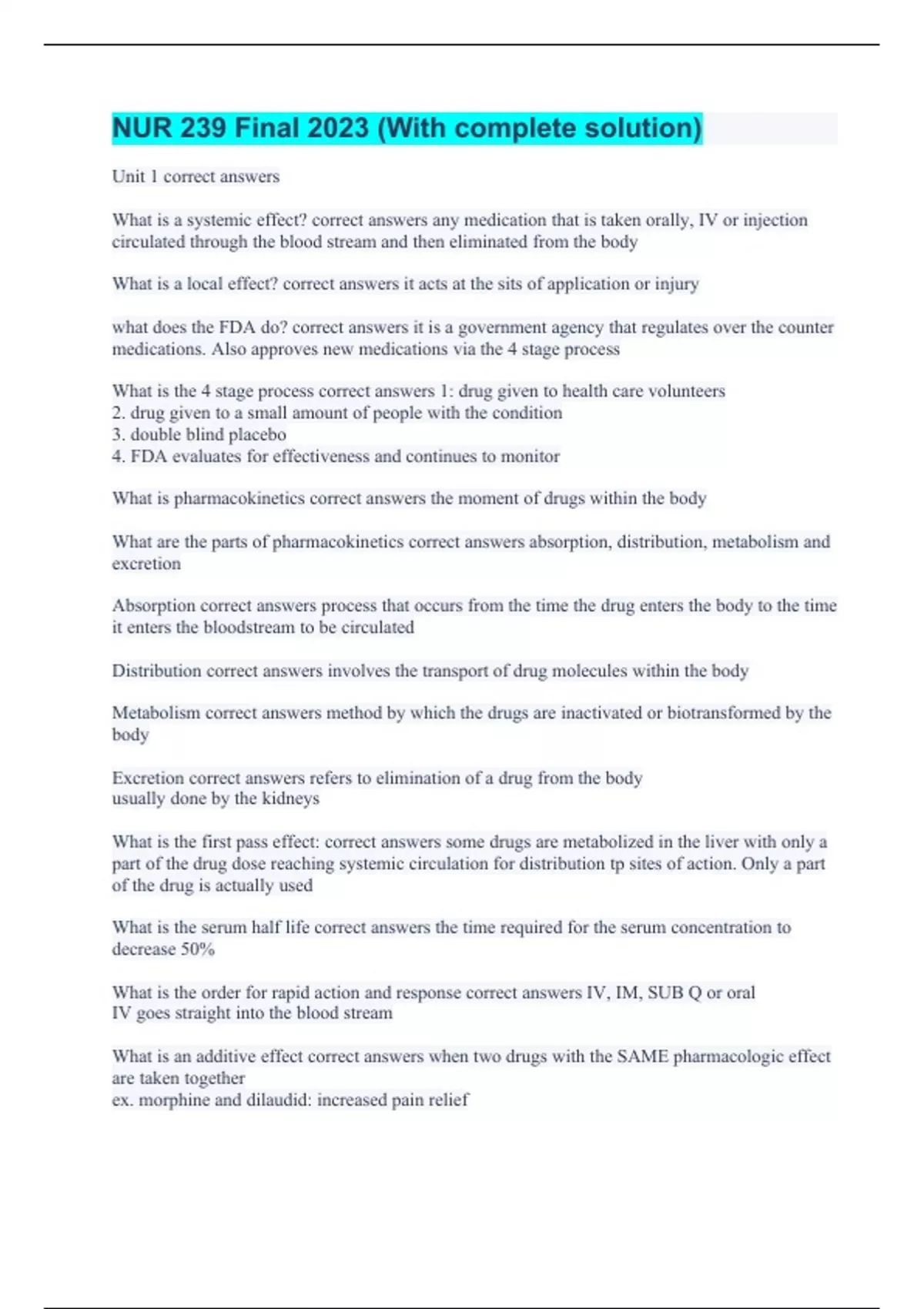 Unit 1 correct answers What is a systemic effect? correct answers any medication that is taken orally, IV or injection circulated through the blood stream and then eliminated from the body What is a local effect? correct answers it acts at the sits of application or injury what does the FDA do? correct answers it is a government agency that regulates over the counter medications. Also approves new medications via the 4 stage process What is the 4 stage process correct answers 1: drug given to health care volunteers 2. drug given to a small amount of people with the condition 3. double blind placebo 4. FDA evaluates for effectiveness and continues to monitor What is pharmacokinetics correct answers the moment of drugs within the body What are the parts of pharmacokinetics correct answers absorption, distribution, metabolism and excretion Absorption correct answers process that occurs from the time the drug enters the body to the time it enters the bloodstream to be circulated Distribution correct answers involves the transport of drug molecules within the body Metabolism correct answers method by which the drugs are inactivated or biotransformed by the body Excretion correct answers refers to elimination of a drug from the body usually done by the kidneys What is the first pass effect: correct answers some drugs are metabolized in the liver with only a part of the drug dose reaching systemic circulation for distribution tp sites of action. Only a part of the drug is actually used What is the serum half life correct answers the time required for the serum concentration to decrease 50% What is the order for rapid action and response correct answers IV, IM, SUB Q or oral IV goes straight into the blood stream What is an additive effect correct answers when two drugs with the SAME pharmacologic effect are taken together ex. morphine and dilaudid: increased pain relief