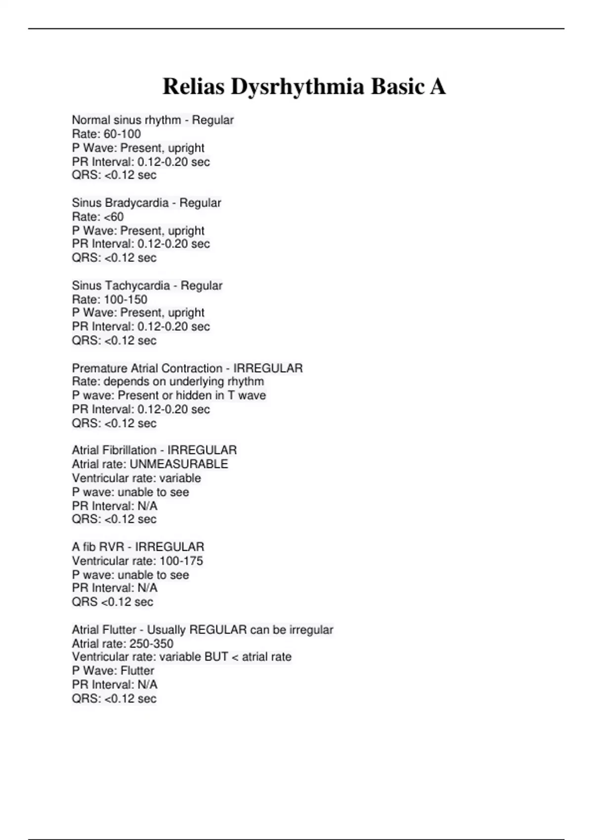 Normal sinus rhythm - Regular Rate: 60-100 P Wave: Present, upright PR Interval: 0.12-0.20 sec QRS: <0.12 sec Sinus Bradycardia - Regular Rate: <60 P Wave: Present, upright PR Interval: 0.12-0.20 sec QRS: <0.12 sec Sinus Tachycardia - Regular Rate: 100-150 P Wave: Present, upright PR Interval: 0.12-0.20 sec QRS: <0.12 sec Premature Atrial Contraction - IRREGULAR Rate: depends on underlying rhythm P wave: Present or hidden in T wave PR Interval: 0.12-0.20 sec QRS: <0.12 sec Atrial Fibrillation - IRREGULAR Atrial rate: UNMEASURABLE Ventricular rate: variable P wave: unable to see PR Interval: N/A QRS: <0.12 sec A fib RVR - IRREGULAR Ventricular rate: 100-175 P wave: unable to see PR Interval: N/A QRS <0.12 sec Atrial Flutter - Usually REGULAR can be irregular Atrial rate: 250-350 Ventricular rate: variable BUT < atrial rate P Wave: Flutter PR Interval: N/A QRS: <0.12 sec Supraventricular Tachycardia - Regular Rate: 150-350 P wave: Hidden in QRS or T wave PR: unable to determine QRS: <0.12 sec Junctional Rhythm - Regular Rate: 40-60 P Wave: ABSENT or INVERTED PR Interval: None or <0.12 QRS: <0.12 sec Accelerated Junctional Rhythm - Regular Rate: 60-100 P Wave: NONE or INVERTED PR Interval: None or <0.12 QRS: <0.12 sec Junctional Tachycardia - Regular Rate: >100 P Wave: NONE or INVERTED PR Interval: None or <0.12 QRS: <0.12 sec