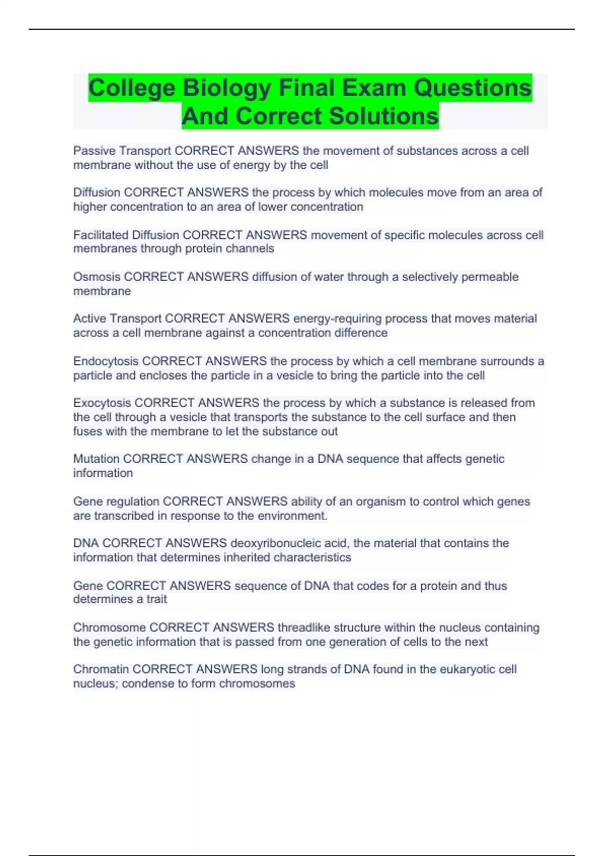 College Biology Final Exam Questions And Correct Solutions