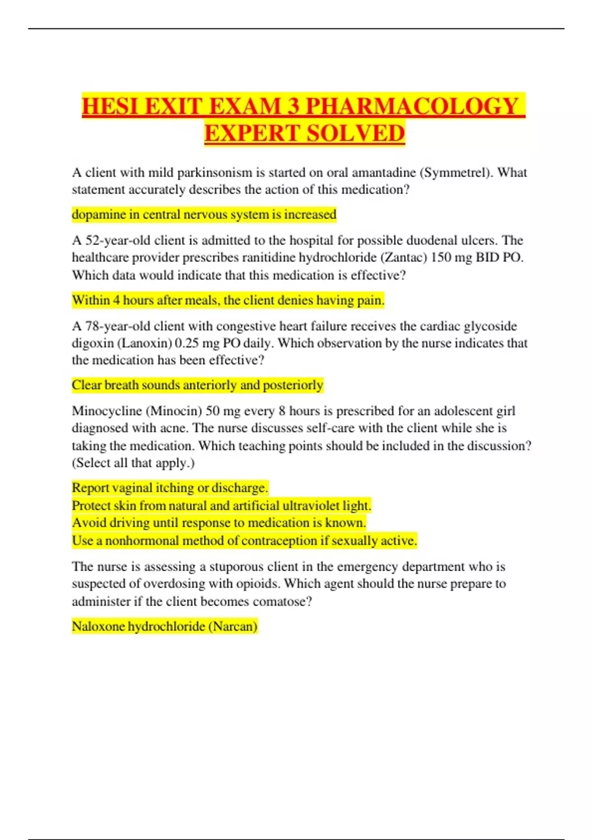 HESI EXIT EXAM 3 PHARMACOLOGY EXPERT SOLVED A client with mild parkinsonism is started on oral amantadine (Symmetrel). What statement accurately describes the action of this medication? dopamine in central nervous system is increased A 52-year-old client is admitted to the hospital for possible duodenal ulcers. The healthcare provider prescribes ranitidine hydrochloride (Zantac) 150 mg BID PO. Which data would indicate that this medication is effective? Within 4 hours after meals, the client denies having pain. A 78-year-old client with congestive heart failure receives the cardiac glycoside digoxin (Lanoxin) 0.25 mg PO daily. Which observation by the nurse indicates that the medication has been effective? Clear breath sounds anteriorly and posteriorly Minocycline (Minocin) 50 mg every 8 hours is prescribed for an adolescent girl diagnosed with acne. The nurse discusses self-care with the client while she is taking the medication. Which teaching points should be included in the discussion? (Select all that apply.) Report vaginal itching or discharge. Protect skin from natural and artificial ultraviolet light. Avoid driving until response to medication is known. Use a nonhormonal method of contraception if sexually active. The nurse is assessing a stuporous client in the emergency department who is suspected of overdosing with opioids. Which agent should the nurse prepare to administer if the client becomes comatose? Naloxone hydrochloride (Narcan)