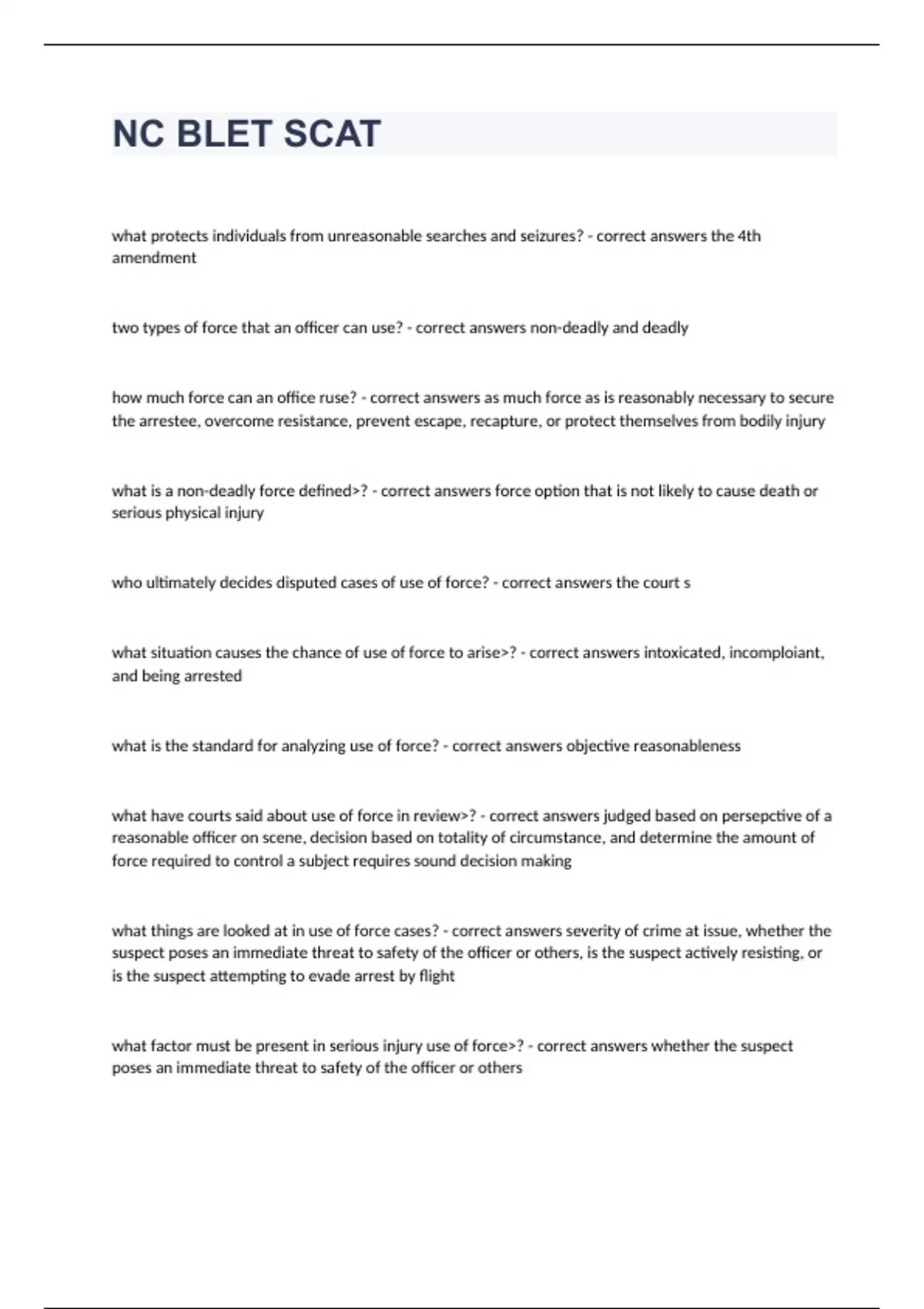 NC BLET SCATwhat protects individuals from unreasonable searches and seizures? - correct answers the 4th amendment two types of force that an officer can use? - correct answers non-deadly and deadly how much force can an office ruse? - correct answers as much force as is reasonably necessary to secure the arrestee, overcome resistance, prevent escape, recapture, or protect themselves from bodily injury what is a non-deadly force defined>? - correct answers force option that is not likely to cause death or serious physical injury who ultimately decides disputed cases of use of force? - correct answers the court s what situation causes the chance of use of force to arise>? - correct answers intoxicated, incomploiant, and being arrested what is the standard for analyzing use of force? - correct answers objective reasonableness what have courts said about use of force in review>? - correct answers judged based on persepctive of a reasonable officer on scene, decision based on totality of circumstance, and determine the amount of force required to control a subject requires sound decision making what things are looked at in use of force cases? - correct answers severity of crime at issue, whether the suspect poses an immediate threat to safety of the officer or others, is the suspect actively resisting, or is the suspect attempting to evade arrest by flight what factor must be present in serious injury use of force>? - correct answers whether the suspect poses an immediate threat to safety of the officer or others what is critical in determine the use of force option to be used? - correct answers the perception of the officer what should officers do after a use of force? - correct answers document all factors or totality of circumstances that made them use that use of force option what is deadly force? - correct answers force that can only be interpreted as creating a substantial risk of causing death to serious injury to a subject when can an officer be justified in using deadly force?> - correct answers defend himself/others from what is believed to be the use or imminenet use of deadly force, to prevent escape from custody of a person who is reasonably believed to be escaping using a deadly weapon, prevent escape of person convicted for a delony that was in custody what does North Carolina law say about use of deadly force against a fleeing subject suspected of a crime? - correct answers it cannot be used unless the persons conduct presents an imminent threat of death or serious injury when can conducted energy weapons be used on someone? - correct answers actively resisting suspect who poses a risk of immediate danger to an officer or another person what is a force option model? - correct answers should be used as a guide for officers in their use of force options what determines the use of force displayed by an officer? - correct answers the force displayed be the subject true or false.....the use of force continumm is a specific path for officers to follow? - correct answers false three parts to a use of force narrative? - correct answers assessment of initial call, observations made during the call, actions taken, summary of encounter, and avoid conclusory statements how far should you be from someone for reactionary distance? - correct answers 6 feet minimum types of relative positioning? - correct answers inside position, interview position, side position, escort position, rear position what should an officer do if they can not immediately gain a tactical advantage in a fight? - correct answers disengage or escape then re-evaluate what is the most dangerous task that officers encounter? - correct answers arresting situations main reasons for injury or death of law enforcement officers? - correct answers carelessness, overconfidence, lack of training types of reactions people have to arrest? - correct answers submit no resistance, attempt to flee custody, forcefully resist, attempt suicide all suspects should be treated as what? - correct answers a threat what will you want when conducting a warrant arrest? - correct answers superiority manpower, superior firepower, simple plan, surprise, speed, advantageous location what should be used with pressure points? - correct answers loud verbal commands pressure point methods? - correct answers hypoglossal, mandibular angle, jugular notch what is the best way do stimulate the hypoglossal? - correct answers digital tip of the thumb or unsupported middle two fingers define stunning principle? - correct answers the stimulation of overwhelming sensory inout that is sudden, intense and unexpected