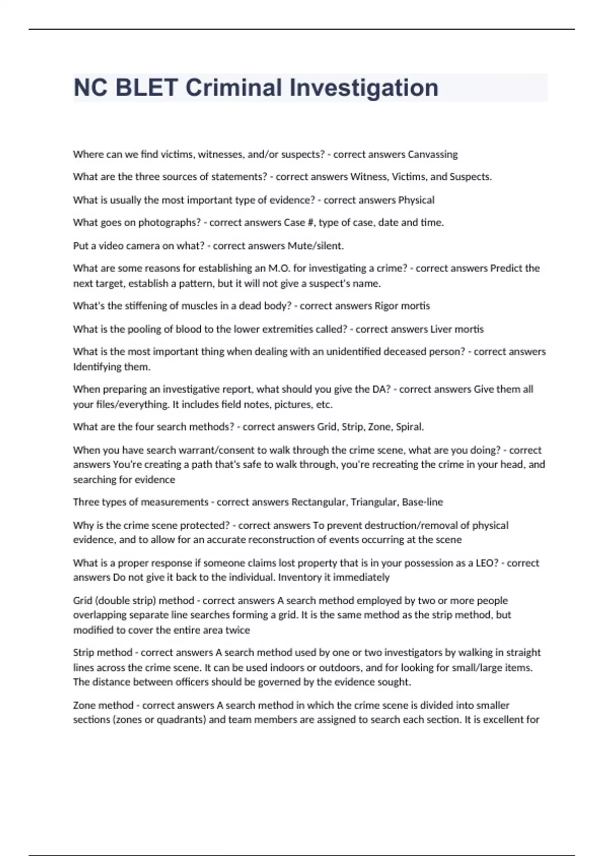 NC BLET Criminal InvestigationWhere can we find victims, witnesses, and/or suspects? - correct answers Canvassing What are the three sources of statements? - correct answers Witness, Victims, and Suspects. What is usually the most important type of evidence? - correct answers Physical What goes on photographs? - correct answers Case #, type of case, date and time. Put a video camera on what? - correct answers Mute/silent. What are some reasons for establishing an M.O. for investigating a crime? - correct answers Predict the next target, establish a pattern, but it will not give a suspect's name. What's the stiffening of muscles in a dead body? - correct answers Rigor mortis What is the pooling of blood to the lower extremities called? - correct answers Liver mortis What is the most important thing when dealing with an unidentified deceased person? - correct answers Identifying them. When preparing an investigative report, what should you give the DA? - correct answers Give them all your files/everything. It includes field notes, pictures, etc. What are the four search methods? - correct answers Grid, Strip, Zone, Spiral. When you have search warrant/consent to walk through the crime scene, what are you doing? - correct answers You're creating a path that's safe to walk through, you're recreating the crime in your head, and searching for evidence Three types of measurements - correct answers Rectangular, Triangular, Base-line Why is the crime scene protected? - correct answers To prevent destruction/removal of physical evidence, and to allow for an accurate reconstruction of events occurring at the scene What is a proper response if someone claims lost property that is in your possession as a LEO? - correct answers Do not give it back to the individual. Inventory it immediately Grid (double strip) method - correct answers A search method employed by two or more people overlapping separate line searches forming a grid. It is the same method as the strip method, but modified to cover the entire area twice Strip method - correct answers A search method used by one or two investigators by walking in straight lines across the crime scene. It can be used indoors or outdoors, and for looking for small/large items. The distance between officers should be governed by the evidence sought. Zone method - correct answers A search method in which the crime scene is divided into smaller sections (zones or quadrants) and team members are assigned to search each section. It is excellent for individual rooms and vehicles. It is particularly good when looking for small items of evidence. Officers participating should check areas already searched by others. Spiral Method - correct answers A search method in which the investigator move in an inward spiral from the boundary to the center of the scene or in an outward spiral from the center to the boundary of a scene. It is best used for large areas. Officers can start inside working out or the reverse When conducting a search of a crime scene, it is best to start the scene how? - correct answers Start the scene large and then reduce it A rough sketch should include - correct answers all items necessary to reconstruct the scene all items of evidence accurate measurements relative proportions an indicator showing north All items collected at a crime scene must include information on the container, including - correct answers case number, date/time of collection, item number, and collector's name/initials How do you identify possible suspects? - correct answers Through eyewitnesses, circumstantial evidence, establishing a method of operation, and physical evidence M.O. - correct answers method of operation Not disclosing discovery in superior court is - correct answers a felony What are the reasons for establishing an M.O.? - correct answers show a pattern of criminal behavior associate numerous crimes with a single suspect possibly predict the perpetrator's next target assist investigators in recognizing the characteristics of criminal activity If you see the same person showing up at numerous fires - correct answers it is suspicious, and could establish a suspect for arson A suicide must always be investigated with the thoroughness of a - correct answers homicide investigation A victim of current physical abuse calls 911. As the responding LEO, upon arrival to the scene you notice the bruises the victim has are green/yellow. This is in indication of what? - correct answers The victim may be lying about the time frame of when the bruises occurred. She should be referred to medical services to confirm the veracity of her claims. A statement - correct answers is a first-hand account of a crime as given to an investigating LEO The minimum identification in the written report for anyone interviewed should include - correct answers Full name, sex/race/DOB, home address/phone #, business address/phone#, cell phone #s, E-mail address, next of kin/friend contact info What order should a person's statement tell the facts in? - correct answers The order in which they recall them. When can you delete photographs of a crime scene? - correct answers Never under any circumstances. A proper reconstruction of the crime scene must include - correct answers Field notes, photographs, a crime scene sketch, and evidence custody documents Why are crime scene searches conducted? - correct answers To locate evidence which will corroborate statements provided and, when the suspect is unknown, lead to the identity of a suspect. Triangulation Method - correct answers From two fixed points, measurements are taken to specified points on an item or within the crime scene. There is no need to worry about whether or not measurements have been made at a right angle because the points derive from a known fixed point, such as the corner of a room, or edge of a door frame. From these fixed points, a minimum of two measurements are made to each identified point Rectangular Coordinate Method - corre