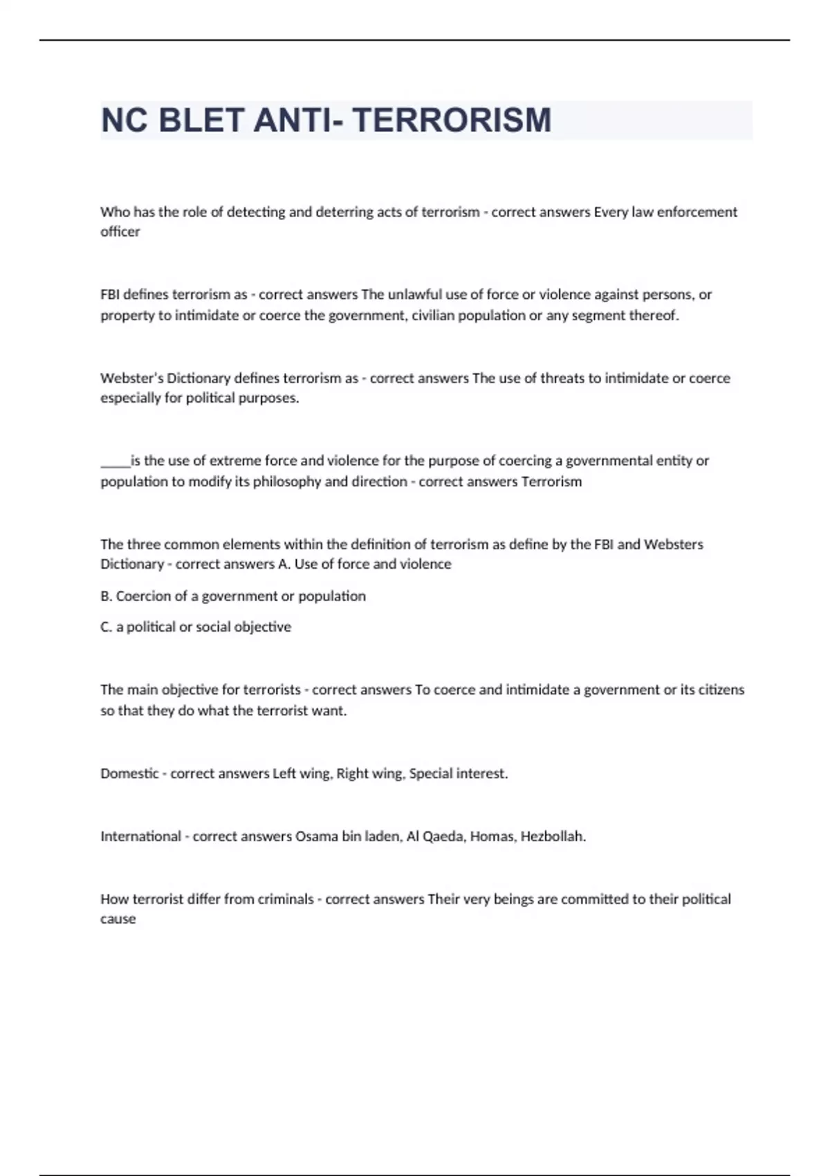 NC BLET ANTI- TERRORISM questions well answered rated A+