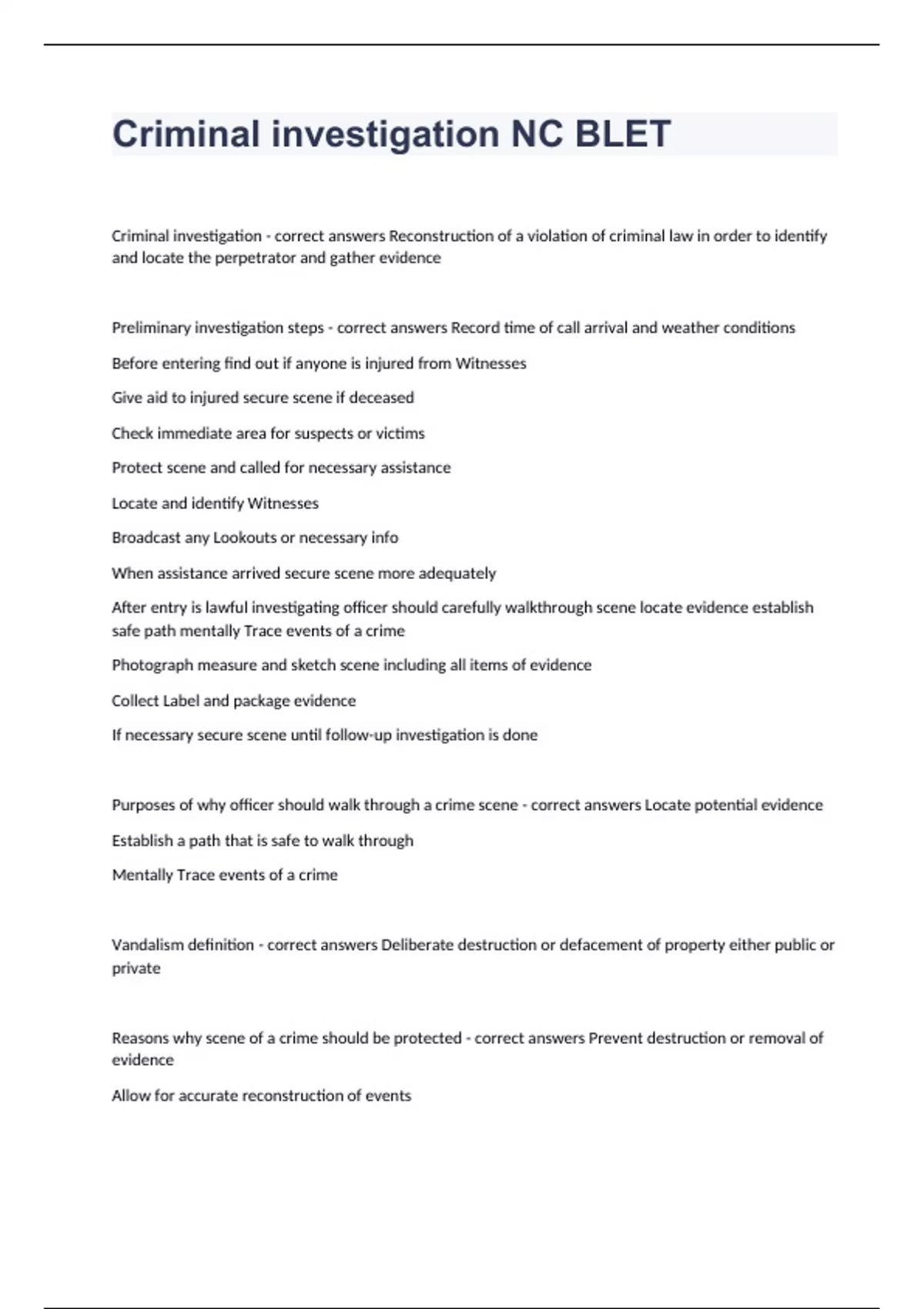 Criminal investigation NC BLETCriminal investigation - correct answers Reconstruction of a violation of criminal law in order to identify and locate the perpetrator and gather evidence Preliminary investigation steps - correct answers Record time of call arrival and weather conditions Before entering find out if anyone is injured from Witnesses Give aid to injured secure scene if deceased Check immediate area for suspects or victims Protect scene and called for necessary assistance Locate and identify Witnesses Broadcast any Lookouts or necessary info When assistance arrived secure scene more adequately After entry is lawful investigating officer should carefully walkthrough scene locate evidence establish safe path mentally Trace events of a crime Photograph measure and sketch scene including all items of evidence Collect Label and package evidence If necessary secure scene until follow-up investigation is done Purposes of why officer should walk through a crime scene - correct answers Locate potential evidence Establish a path that is safe to walk through Mentally Trace events of a crime Vandalism definition - correct answers Deliberate destruction or defacement of property either public or private Reasons why scene of a crime should be protected - correct answers Prevent destruction or removal of evidence Allow for accurate reconstruction of events Why is Oscar can accomplish tasks of removing unauthorized persons from immediate area within crime scene - correct answers Posting additional officers at entrances Roping off involved area Placing signs on doors Barricades to block streets Used cones or flares to block areas will provide direction of travel Used Patrol vehicles to block streets or areas Areas common to most crime scenes that should be identified immediately - correct answers Place of arrival Point of entry Path through scene Contact with scene Contact with victim Place of exit Place of arrest Prostitution definition - correct answers Performance or offer of any sex act for money Purpose of videotaping crime scene - correct answers Assist in explaining what happened as well as how it happened and when it may have occurred Factors for consideration when officer is videotaping crime scene - correct answers To assist in explaining what happened Camera held at a level on every shot No narration Perimeter to Center Shot initially without scales Small items initially shot in place without Zoom