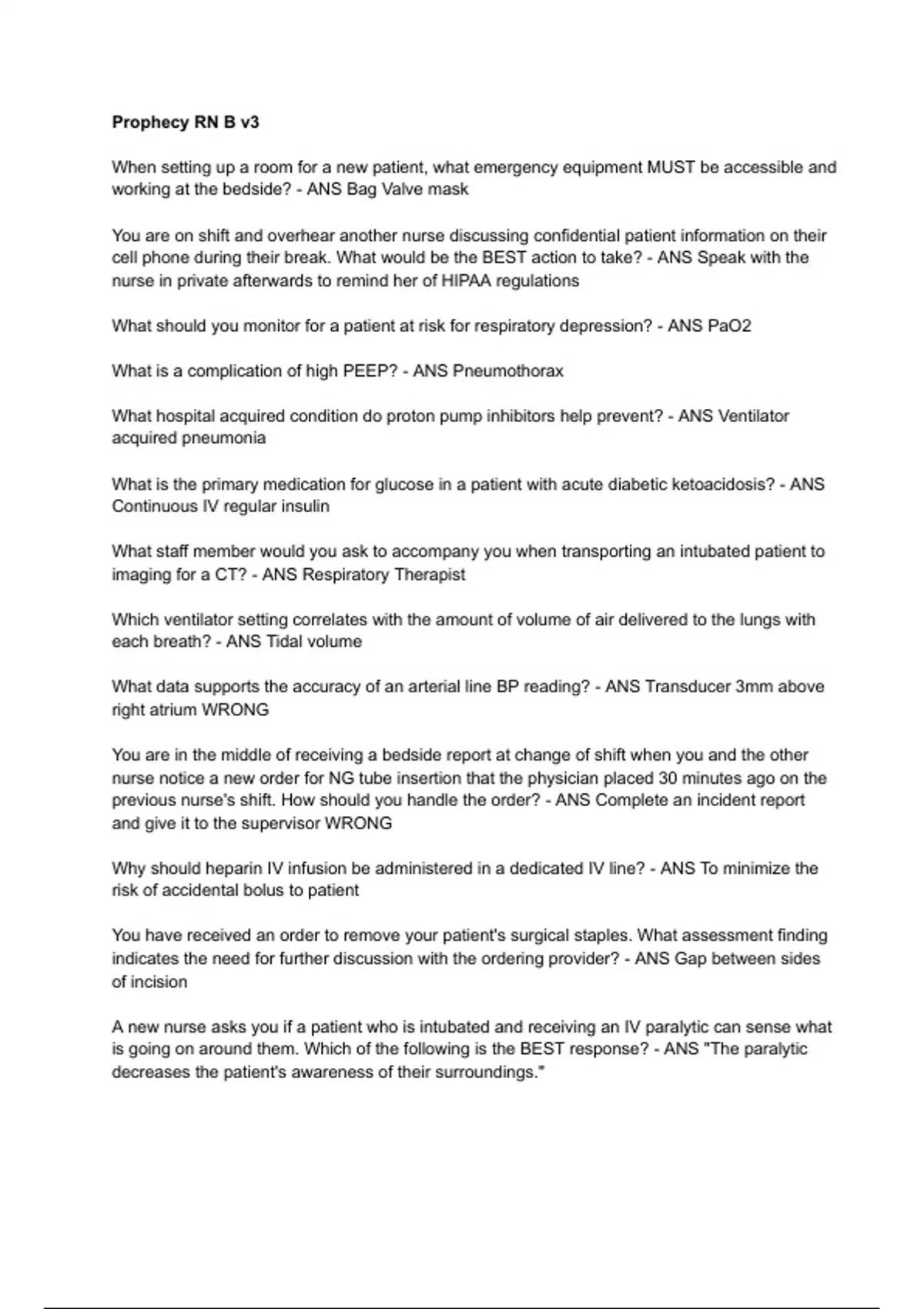Prophecy RN B v3 When setting up a room for a new patient, what emergency equipment MUST be accessible and working at the bedside? - ANS Bag Valve mask You are on shift and overhear another nurse discussing confidential patient information on their cell phone during their break. What would be the BEST action to take? - ANS Speak with the nurse in private afterwards to remind her of HIPAA regulations What should you monitor for a patient at risk for respiratory depression? - ANS PaO2 What is a complication of high PEEP? - ANS Pneumothorax