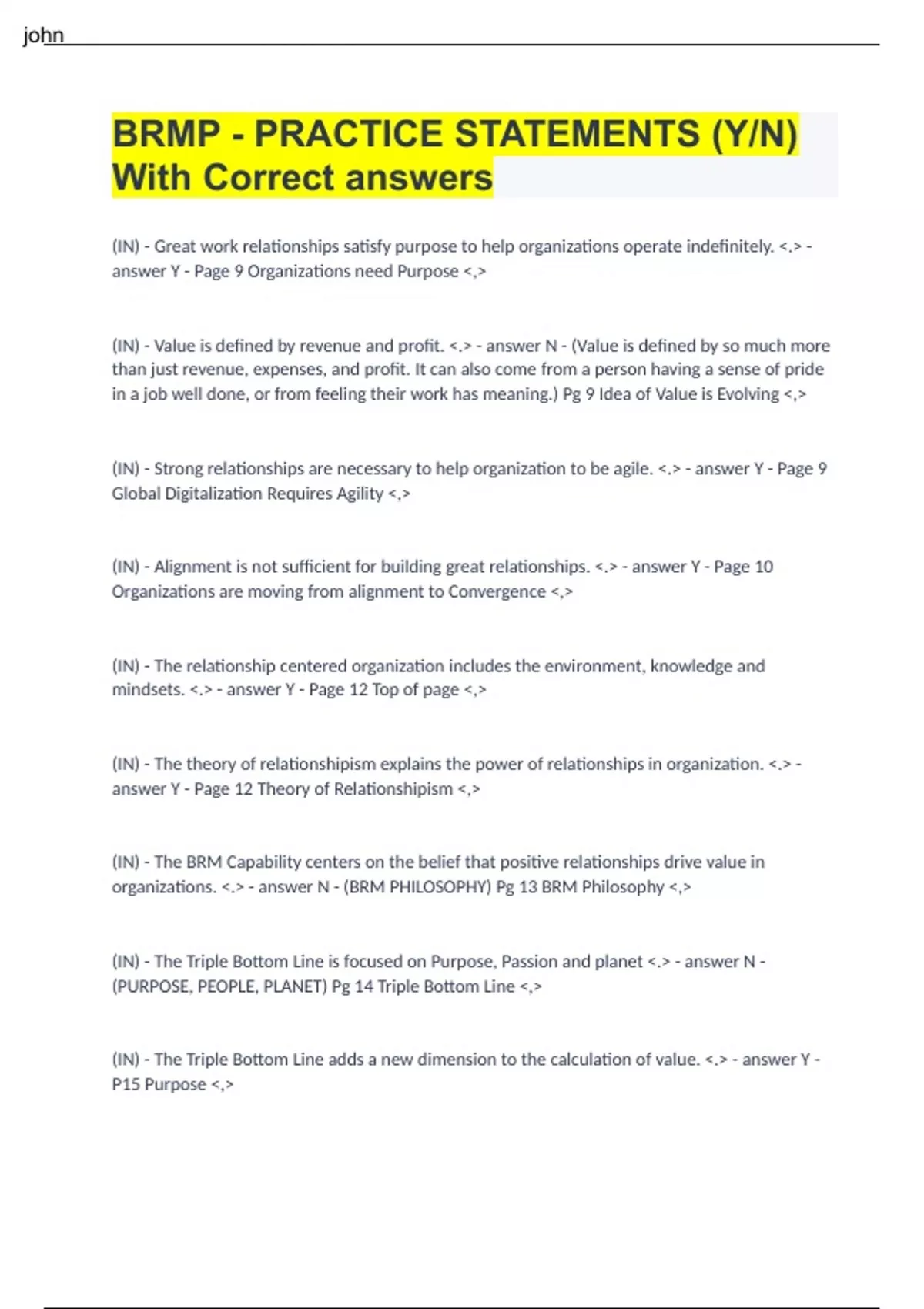 BRMP - PRACTICE STATEMENTS (Y/N) With Correct answers