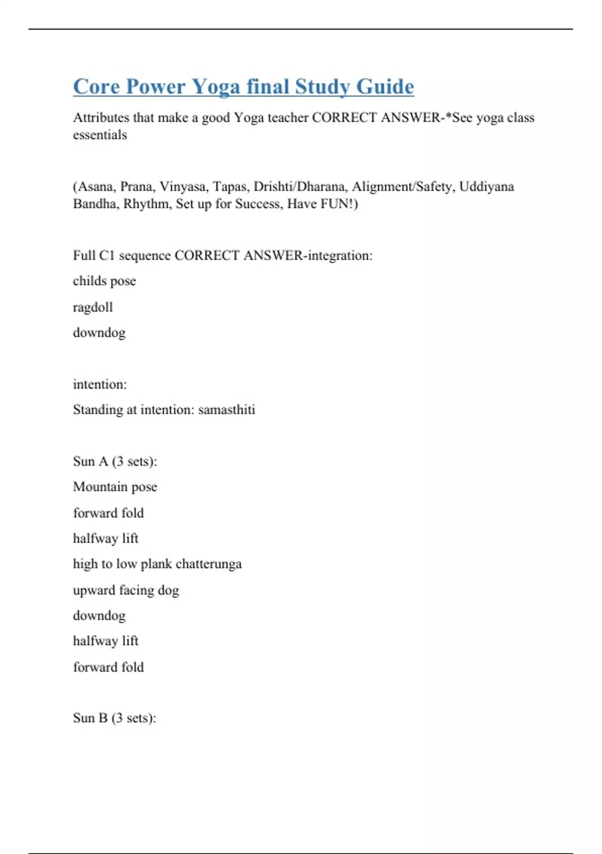 Attributes that make a good Yoga teacher CORRECT ANSWER-*See yoga class essentials (Asana, Prana, Vinyasa, Tapas, Drishti/Dharana, Alignment/Safety, Uddiyana Bandha, Rhythm, Set up for Success, Have FUN!) Full C1 sequence CORRECT ANSWER-integration: childs pose ragdoll downdog intention: Standing at intention: samasthiti Sun A (3 sets): Mountain pose forward fold halfway lift high to low plank chatterunga upward facing dog downdog