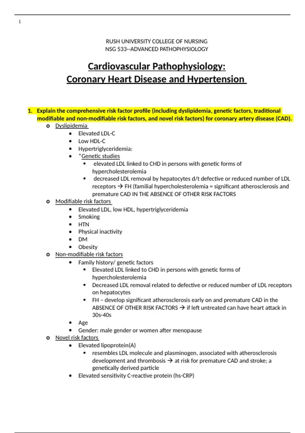 NURS 533 Exam 3 Objectives Cardiovascular Pathophysiology: Coronary Heart Disease and Hypertension/NURS 533 Exam 3 Objectives Cardiovascular Pathophysiology: Coronary Heart Disease and Hypertension