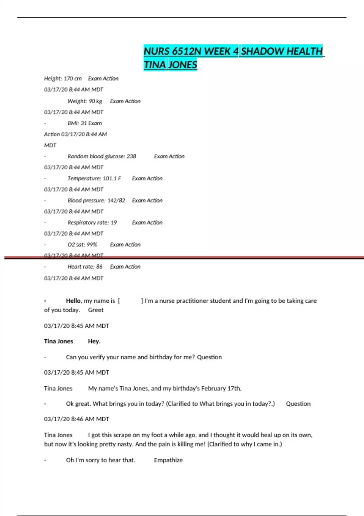 NURS 6512N WEEK 4 SHADOW HEALTH TINA JONES Height: 170 cm Exam Action