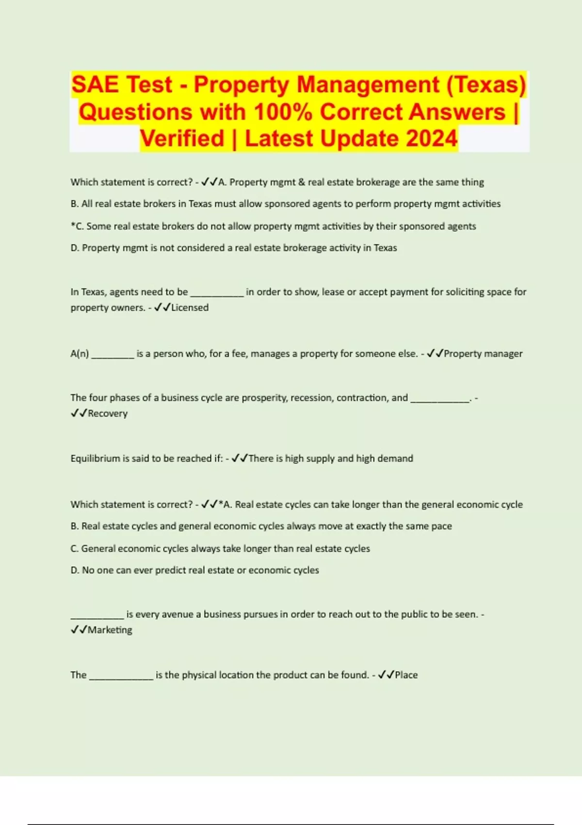 SAE Test - Property Management (Texas) Questions with 100% Correct Answers | Verified | Latest Update 2024