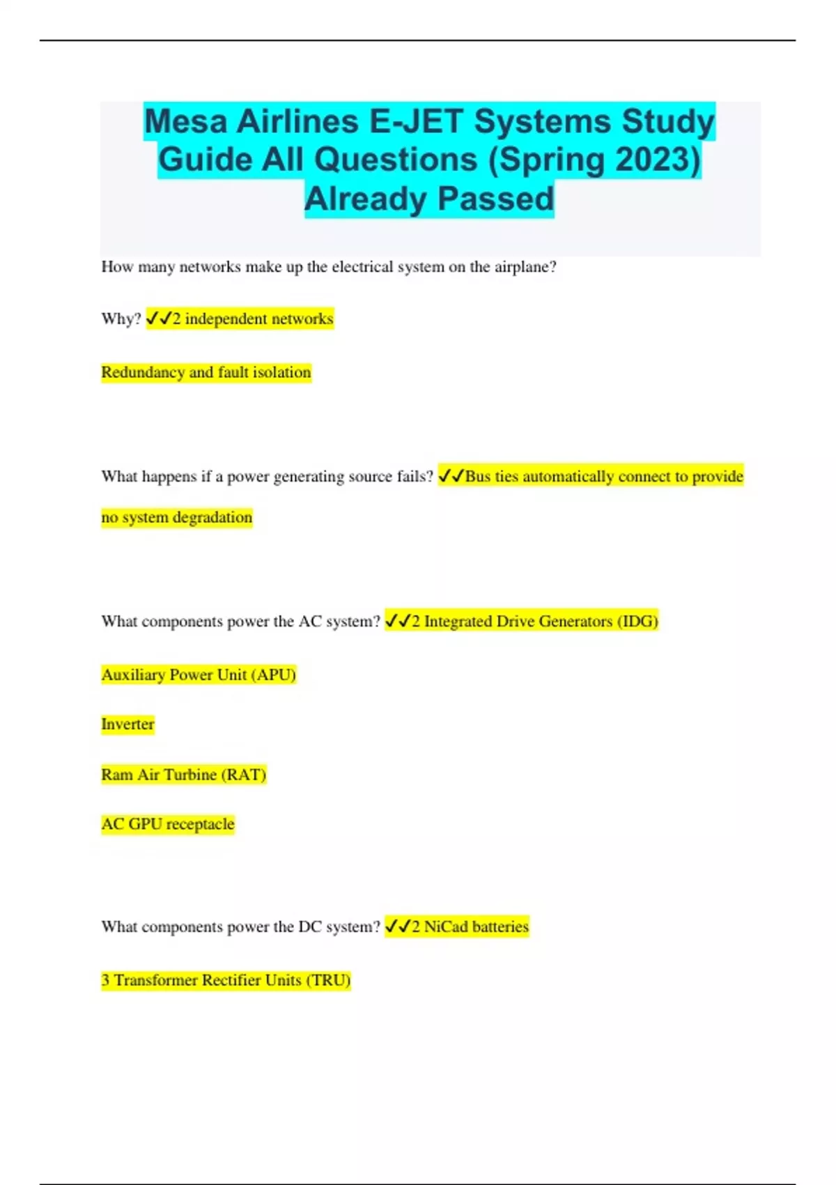 Mesa Airlines E-JET Systems Study Guide All Questions (Spring 2023) Already Passed How many networks make up the electrical system on the airplane? Why? 2 independent networks Redundancy and fault isolation What happens if a power generating source fails? Bus ties automatically connect to provide no system degradation What components power the AC system? 2 Integrated Drive Generators (IDG) Auxiliary Power Unit (APU) Inverter Ram Air Turbine (RAT) AC GPU receptacle What components power the DC system? 2 NiCad batteries 3 Transformer Rectifier Units (TRU) DC GPU receptacle How does the IDG maintain a stable power output? A Constant Speed Drive (CSD) attaches the IDG to the AGB (Accessory Gear Box) What monitors and controls the IDG's? Each has a Generator Control Unit (GCU) Can one IDG supply the entire electrical system? Yes What will cause the amber IDG light on the overhead panel to illuminate? High oil temperature Low oil pressure If an IDG is manually disconnected can it be reconnected by the flight crew? No. This is a maintenance function What is the primary purpose the AC generators? To power the AC BUSES and AC ESS BUS which... Power the 3 Transformer Rectifier Units (TRU) 1, 2, and AC STBY BUS What is the purpose of the Transformer Rectifier Units? To convert 115 VAC to 28 VDC Can the APU replace a failed IDG? Yes What is the AC electrical system's priority? Onside (IDG) Inside (APU) Outside (GPU) Cross-Side (Other IDG) How is it known that an AC GPU is hooked up to the airplane and ready to provide electricity? GPU button displays AVAIL and the GPU icon is presented on the electrical synoptic page Once the GPU button is pushed in, the button will display IN USE provided another AC power source is not available. What does it mean if the AC GPU is plugged in and the outside GPU panel button displays IN USE? Ground service bus is in use Cockpit GPU button will display AVAIL even though the ground service bus is in use If the airplane is using the AC GPU and the APU is started what should the pilot be sure