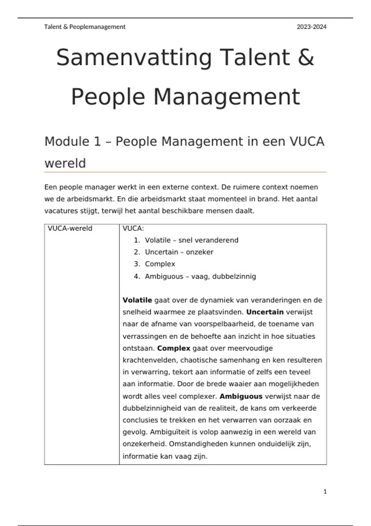 Dit is een volledige samenvatting van de lessen (PPT + studiebundel) van het vak Talent & People Management. Dit vak wordt in het derde jaar gegeven door Liesbet Vyverman op de Arteveldehogeschool in de richting Organisatie & Management (HR).