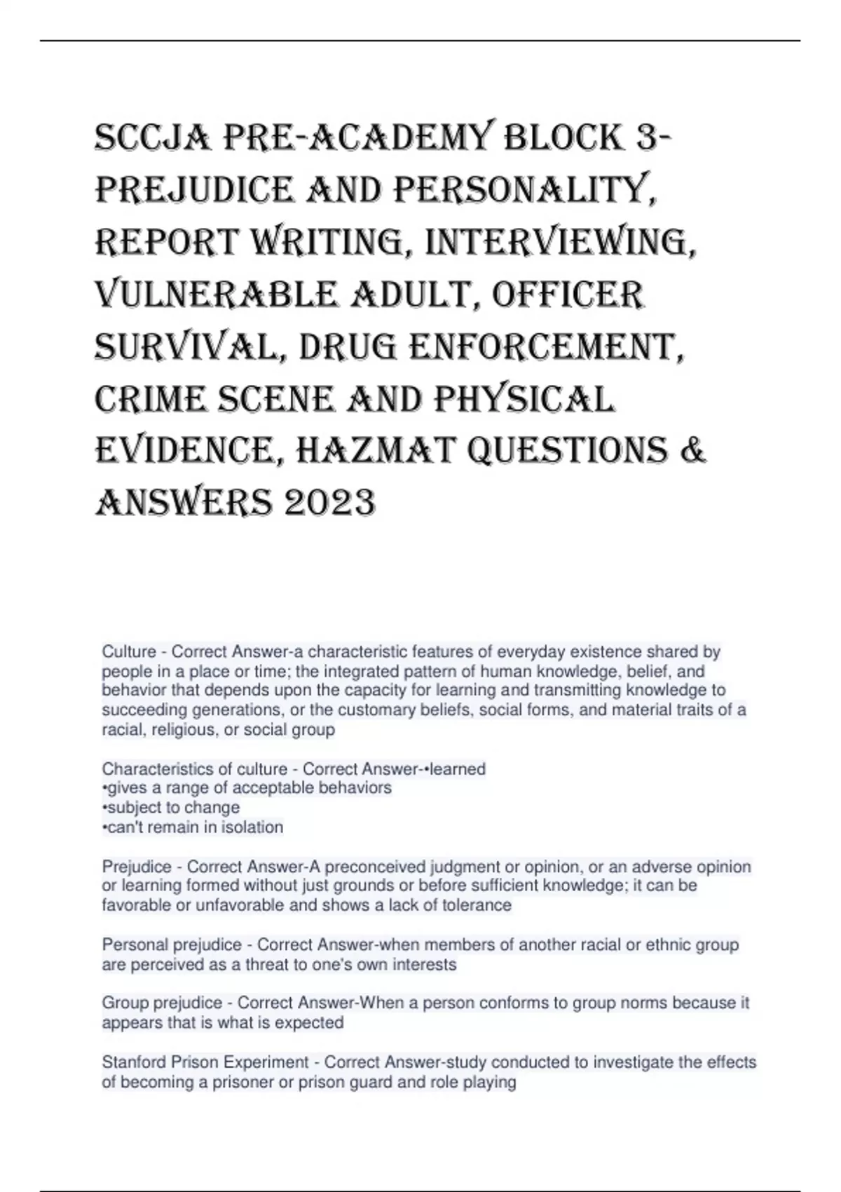 SCCJA Pre-Academy Block 3- Prejudice and Personality, Report Writing, Interviewing, Vulnerable Adult, Officer Survival, Drug Enforcement, Crime Scene and Physical Evidence, Hazmat Questions & Answers 2023 Culture - Correct Answer-a characteristic features of everyday existence shared by people in a place or time; the integrated pattern of human knowledge, belief, and behavior that depends upon the capacity for learning and transmitting knowledge to succeeding generations, or the customary beliefs, social forms, and material traits of a racial, religious, or social group Characteristics of culture - Correct Answer-•learned •gives a range of acceptable behaviors •subject to change •can't remain in isolation Prejudice - Correct Answer-A preconceived judgment or opinion, or an adverse opinion or learning formed without just grounds or before sufficient knowledge; it can be favorable or unfavorable and shows a lack of tolerance Personal prejudice - Correct Answer-when members of another racial or ethnic group are perceived as a threat to one's own interests Group prejudice - Correct Answer-When a person conforms to group norms because it appears that is what is expected Stanford Prison Experiment - Correct Answer-study conducted to investigate the effects of becoming a prisoner or prison guard and role playing Brown Eyes, Blue Eyes Experiment - Correct Answer-Study conducted to demonstrate his prejudicial attitudes and intolerance can affect even the youngest of people intolerance - Correct Answer-unwillingness to accept views, beliefs, or behavior that differ from one's own; based on ignorance, indifference, and limited perception ignorance - Correct Answer-lack of knowledge or information indifference - Correct Answer-lack of interest, concern, or sympathy Limited perception - Correct Answer-Perceiving others through a range of limited experiences which ultimately could create stereotyping of an entire group stereotype - Correct Answer-a generalized (sometimes accurate but often overgeneralized) belief about a group of people 3 ways stereotypes change - Correct Answer-• Bookkeeping-slow adjustment as we learn and adapt to new information • Conversion-old stereotypes are thrown away, usually when there is signification contradictory evidence • Subtyping-new stereotype is created as a sub-classification of the original Hate crime - Correct Answer-criminal offense against a person or property motivated in whole or in part by an offender's bias against a race, religion, disability, ethnic origin or sexual orientation Wisconsin v. Mitchell - Correct Answer-court upheld statute providing for higher penalties if a criminal selects a victim because of their race, religion, or sexual orientation Arguments for hate crime legislation - Correct Answer-•a victim may suffer more psychological harm •victim may suffer more physical trauma •hate crimes have a wide impact •hate crimes may spark retaliation or community unrest Police response at the scene of a hate crime - Correct Answer-•secure the scene •stabilization the victim •preserve the crime scene •identify criminal evidence •1 officer interview the victim •report crime to supervisor •document thoroughly •determine if probable cause exists for arrest How to determine if a hate crime has been committed - Correct Answer-•perceptions of victim and witnesses •suspect's reflection of bias •any differences between victim and suspect •similar incidents in same or nearby location •whether victim was promoting group allegiance •whether incident was close or coincided with a significant holiday for victim •absence of other motive Reasons hate crime victims may not come forward - Correct Answer-•fear of retaliation •humiliation •lack of support •cultural or language barriers Interview techniques for victims of a hate crime - Correct Answer-•reassure them it is not their fault •try to ascertain why the victim feels this happened to them •create an open dialogue •hold neighborhood meetings to ensure community awareness Gold Personality - Correct Answer-•keeper of tradition •motivation is to belong •feel there is a right way to do everything •majority of police officers Green Personality - Correct Answer-•always questioning the status quo •motivation is a quest for power •knowledge is power •visionaries and careful planners Blue Personality - Correct Answer-•searching for meaning of life •motivation is to feel authentic •yearn for self-actualization •peacemakers and cooperative team players Orange Personality - Correct Answer-•wants to do things now •motivation is to be free •like variety and spontaneity •enjoy action and competition Baby Boomers - Correct Answer-•people born between 1946 and 1964 •work to live •motivated by people who tell them they are valued and needed Generation X - Correct Answer-•people born between 1965 and 1980 •self reliant •challenge authority •motivated by hands-off approach Generation Y (Millennials) - Correct Answer-•people both between •motivated by being surrounding with bright, creative people •change jobs frequently •value realism, confidence, and fun Who reads police reports - Correct Answer-•supervisors •investigators •attorneys •judges •backup officers •victims •civil courts •probation officers •advocates •the media Communication - Correct Answer-The exchange of information or the technique of expressing ideas effectively Report - Correct Answer-Any written or electronic communication on a departmental firm Report form - Correct Answer-A preprinted, standardized set of questions Common characteristics of a report - Correct Answer-•made at or about the time of an event and should be accurate to the best of the officer's knowledge •should also reflect what the officer heard at the time of the incident •reports serve as permanent records of events Operational reports - Correct Answer-R