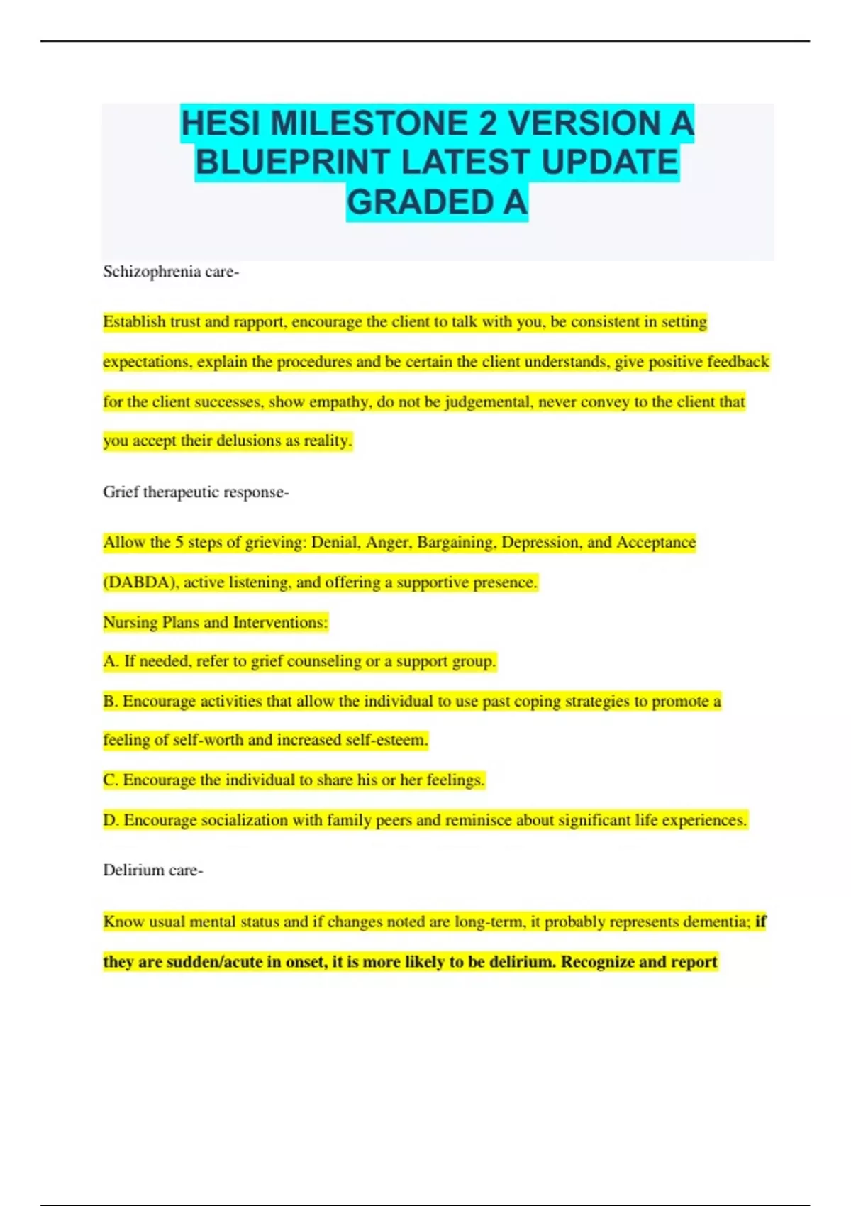 HESI MILESTONE 2 VERSION A BLUEPRINT LATEST UPDATE GRADED A Schizophrenia care- Establish trust and rapport, encourage the client to talk with you, be consistent in setting expectations, explain the procedures and be certain the client understands, give positive feedback for the client successes, show empathy, do not be judgemental, never convey to the client that you accept their delusions as reality. Grief therapeutic response- Allow the 5 steps of grieving: Denial, Anger, Bargaining, Depression, and Acceptance (DABDA), active listening, and offering a supportive presence. Nursing Plans and Interventions: A. If needed, refer to grief counseling or a support group. B. Encourage activities that allow the individual to use past coping strategies to promote a feeling of self-worth and increased self-esteem. C. Encourage the individual to share his or her feelings. D. Encourage socialization with family peers and reminisce about significant life experiences. Delirium care- Know usual mental status and if changes noted are long-term, it probably represents dementia; if they are sudden/acute in onset, it is more likely to be delirium. Recognize and report symptoms immediately. Treatment of underlying causes is important - if untreated, it can lead to permanent, irreversible brain damage and death. The primary goals of nursing care for clients with delirium are: PROTECTION FROM INJURY, MANAGEMENT OF CONFUSION, AND MEETING PHYSIOLOGICAL AND PSYCHOLOGICAL NEEDS. Ensure patient safety (fall risk) and manage behavioral problems. Alert the prescriber of nonessential medications. Nutritional and fluid intake must be monitored. A quiet and calm environment. Encourage visitors to touch and talk to patients. Assess/manage pain. Alzheimer's hallucination- Occurs in the late-middle to later stages of the disease process and is treated with antipsychotics such as Haldol Alcohol withdrawal- Symptoms of withdrawal usually begin 4 to 12 hours after cessation or marked reduction of alcohol intake. Symptoms include coarse hand tremors, sweating, elevated pulse, and blood pressure, insomnia, anxiety, and nausea or vomiting. Severe or untreated withdrawal may progress to transient hallucinations, seizures, or delirium, called delirium tremors. Alcohol withdrawal usually peaks on the second day and is over in about 5 days. This can vary, however, and withdrawal may take 1 to 2 weeks. Safe withdrawal is usually accomplished with the administration of benzodiazepines, such as lorazepam (Ativan), chlordiazepoxide (Librium), or diazepam (Valium), to suppress the withdrawal symptoms. Nursing Plans and Interventions A. Maintain safety, nutrition, hygiene, and rest. B. Obtain a BAL on admission or when a client appears intoxicated after admission. C. Implement suicide precautions if assessment indicates risk. D. In general 1. Monitor vital signs, input and output (I&O), and electrolytes. 2. Observe for impending DTs. 3. Prevent aspiration; implement seizure precautions. 4. Reduce environmental stimuli. 5. Medicate with antianxiety medication, usually chlordiazepoxide (Librium) or lorazepam (Ativan) 6. Provide high-protein diet and adequate fluid intake (limit caffeine). 7. Provide vitamin supplements, especially vitamins B1 and B complex. 8. Provide emotional support. Methadone- Detoxification and maintenance therapy for opioid use disorder. Suppression of withdrawal symptoms during detox related to opioids such as heroin. It can cause respiratory depression. Do not give it to patients with acute or severe bronchial asthma. It is contraindicated for patients taking MAOIs. Methadone Overdose: A). Physical Assessment -Constricted pupils - Respiratory depression leading to respiratory arrest -Circulatory depression leading to cardiac arrest -Unconsciousness leading to coma -Death B). General Appearance -General physical and mental deterioration -Rapid tolerance-overdose likely if not monitored. -Impaired judgment Aggression response- The nurse must protect others from these clients' manipulative or aggressive behaviors. At the beginning of treatment, he or she must set limits on unacceptable behavior. The limit setting involves the following three steps: Inform clients of the rule or limits. Explain the consequences if clients exceed the limit. State expected behavior. Nursing Plans and Interventions: Conduct and Defiant Disorders A. Assess verbal and nonverbal cues for escalating behavior so as to decrease outbursts. B. Use a nonauthoritarian approach. C. Avoid asking "why" questions. D. Initiate a "show of force" with a child who is out of control. E. Use a "quiet room" when external control is needed. F. Clarify expressions or jargon if meanings are unclear. G. Teach to redirect angry feelings to safe alternative, such as a pillow or punching bag. H. Implement behavior modification therapy if indicated. I. Role-play new coping strategies with client. Duty to warn- The obligation of a healthcare provider to warn third parties of potential threats or harm aimed at them by another individual. Schizophrenia- treatment evaluation- 1.) Clients should have decreased agitation, combativeness, and psychomotor activity. 2.) Decreased psychotic behaviors such as decreased hallucinations and delusions. Anxiety drugs risk- Most of these drugs are benzodiazepines, which are commonly prescribed for anxiety. Benzodiazepines have a high potential for abuse and dependence, so their use should be short-term, ideally no longer than 4 to 6 weeks. One chief problem encountered with benzodiazepines is their tendency to cause physical dependence. Significant discontinuation symptoms occur when the drug is stopped; these symptoms often resemble the original symptoms for which the client sought treatment. This is especially a problem for clients with long-term benzodiazepine use, such as those with panic or generalized anxiety disorder. I am 100% convinced that this is the fact that three weeks after starting an anxiolytic, a patient is at a sig